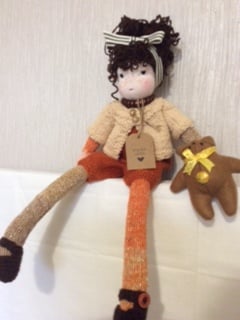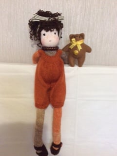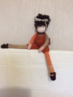 Deirdre just cannot wait to meet her new best friend. She is a very pretty Waldorf type doll and measures approximately 46cm (18 inches). She is hand knitted in pretty sparkly multicoloured wool, mostly tangerine and fawn and is wearing chestnut/orange coloured rompers with a pale mustard cardigan. Cardigan and dress can be removed. Her dark brown coloured shoes are crocheted with a pretty button embellishment. She has a lovely embroidered face with a cheeky smile and button nose with lots of little freckles. Her ringlets are tied up and are made from acrylic wool and she has a pretty striped bow headband.