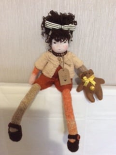 Deirdre just cannot wait to have someone new to play with and of course she goes nowhere without her trusted little friend Teddy Stanley who is made from felt with little black bead eyes and a polka dot yellow ribbon bow.