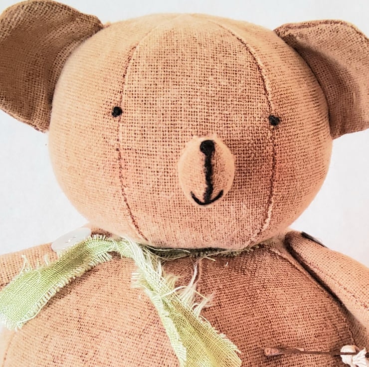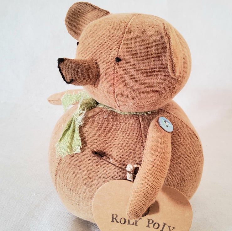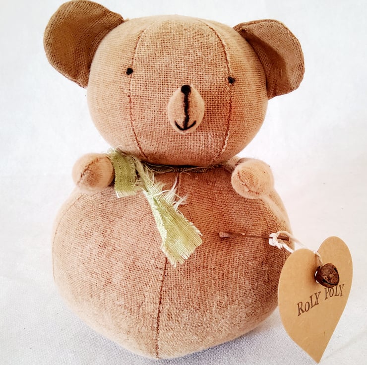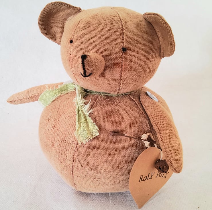 Roly is made from coffee and cinnamon dyed Osnaburg fabric, sanded for a vintage look.He has an embroidered nose and mouth with little traditional glass eyes. His arms have been jointed using mother of pearl buttons. Rolly's scarf has a little rusty bell attached. His bottom has been made slightly flatter by a circle of wool felt - otherwise he would be off rolling around all over the shop !