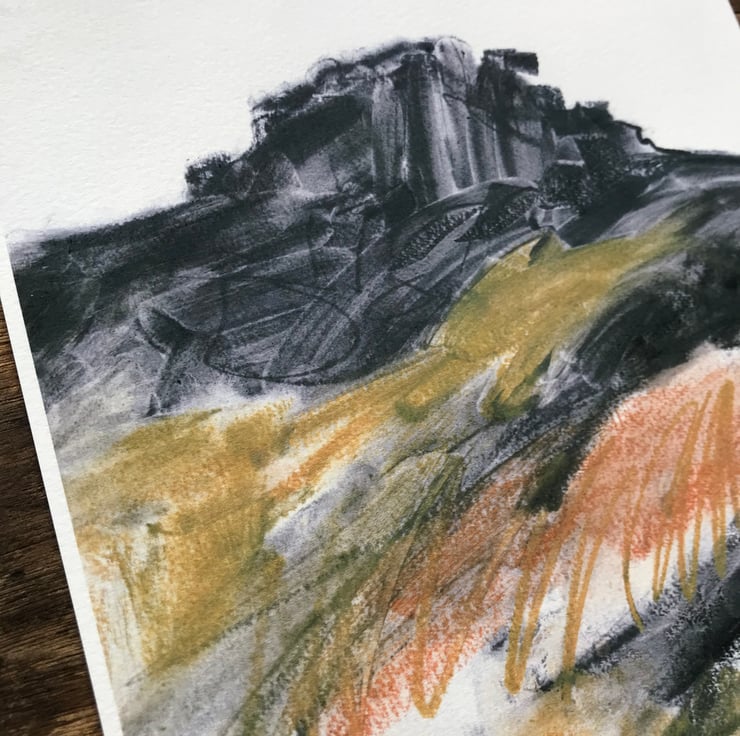 A4 Print taken from my Expressive watercolour landscape painting inspired by Over Owler Tor from below, on the Hathersage, Derbyshire side. Over Owler Tor is an imposing fortress-like millstone grit outcrop near Burbage and the Surprise View on Hathersage Moor in the the Dark Peak area of the Peak District National Park.