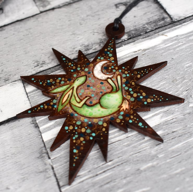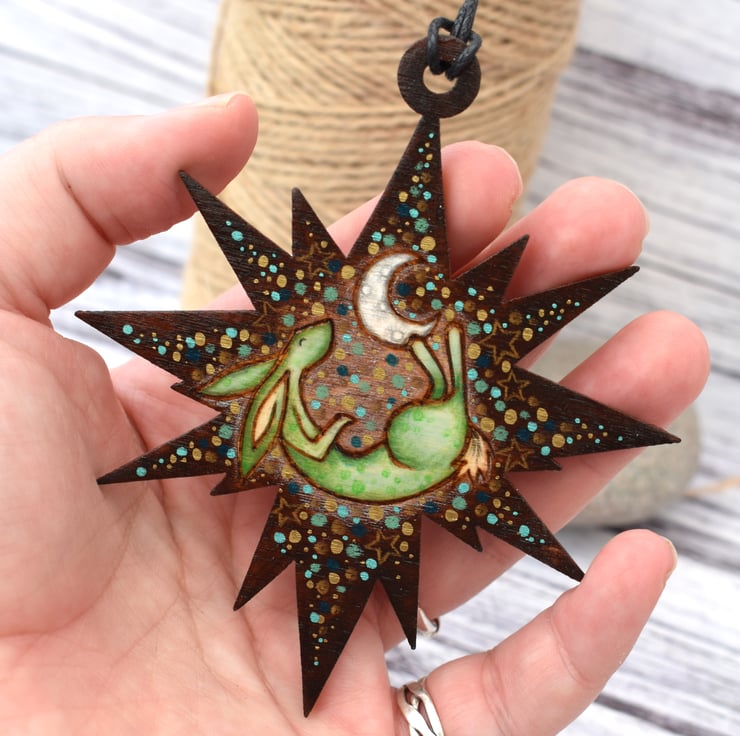 A sage green moon gazing hare floats in a starry sky, on this starburst bauble shape, with metallic accents. Burned by hand using pyrography and coloured using art pencils. I've stained the wood to enhance it. The green in quite hard to capture, but in my opinion it's a grassy sage.