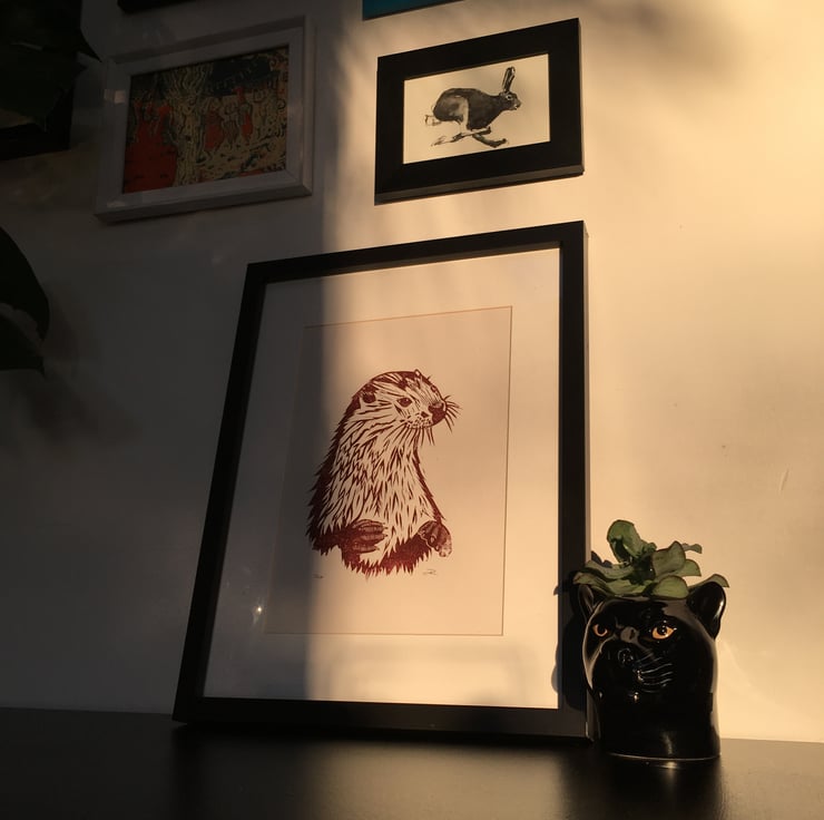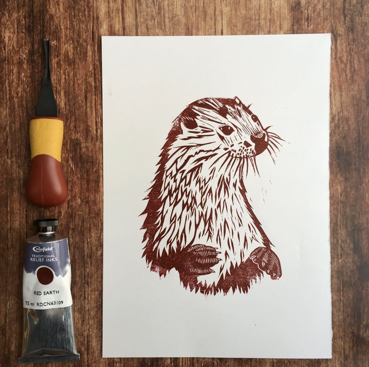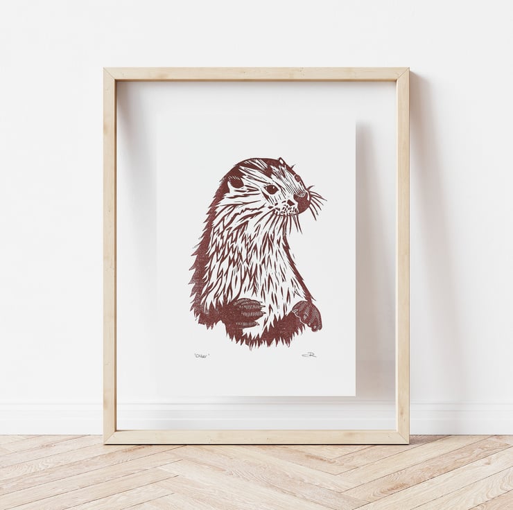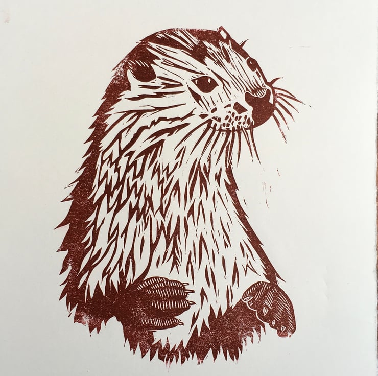 A4 lino print of an otter, in oil based dark red ink on off-white 190gsm acid-free paper.
