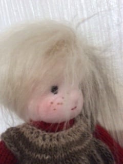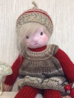 Scarlett just cannot wait to meet her new best friend. She is a very pretty Waldorf type doll and measures approximately 36cm (14 inches). She is hand knitted in scarlet red coloured acrylic wool and is wearing multi-coloured dress in shades of dove grey. Her bobble hat, is knitted to match in beige and scarlet strips. Hat and dress can both be removed. Her light beige coloured shoes are crocheted with pretty red buttons. She has a lovely embroidered face with a cheeky smile and button nose with lots of little freckles. Her hair is made from fluffy faux fur and can be quite unruly so at the moment she has it tied back in a ponytail but it can be lightly brushed into another style if she fancies letting it blow in the wind.