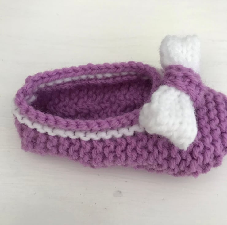 These pretty shoes are hand knitted in a soft baby yarn. They have a white bow on the front and white trimming round the top.