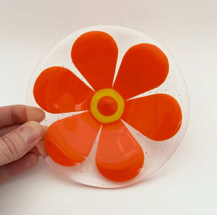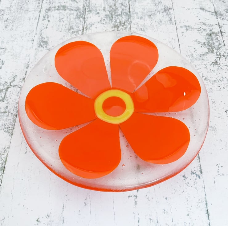 To make this dish, firstly I hand cut 2 circles of transparent art glass. Next I use opaque pimento red, orange and yellow art glass and hand cut and shape each glass petal and circle. Then I carefully arrange the pieces onto the background circles and fire it overnight in my kiln. I then fire the piece a second time to slowly slump it into a ceramic mould. Transparent glass with pimento red petals and yellow and orange centre. All glass is hand cut and assembled, therefore no 2 are exactly the same. One Supplied.