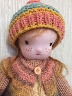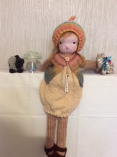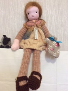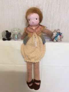 Clover just cannot wait to meet her new best friend. She is a very pretty Waldorf type doll and measures approximately 40cm (15 and a bit inches). She is hand knitted from pretty pale salmon coloured acrylic wool and is wearing a lovely pale cream coloured dress and multicoloured cardigan, which can both be removed. Her brown shoes are crocheted and have a pretty button embellishment. She also has a matching bobble hat. She has a lovely embroidered face with a cheeky smile and button nose with lots of little freckles. Her hair has been crocheted from long fibre mohair wool which she wears in plaits over each shoulder in a pretty chestnut colour.