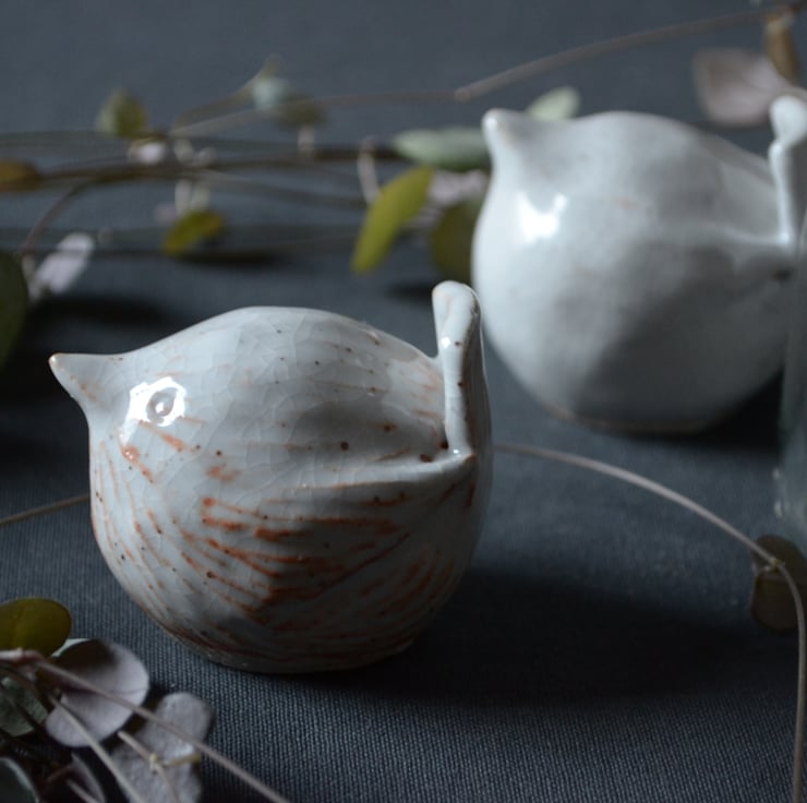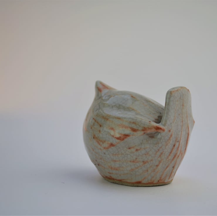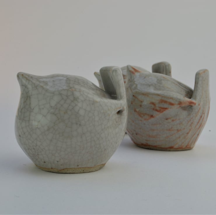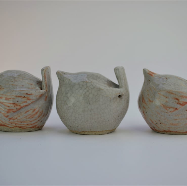 These little wrens have a light grey overall colour but with a delicate crackle glaze wrapping around them. The crackles are highlighted with a darker tint and form a lovely subtle pattern over the carved bird. These have warm brown flashings on the wings where the iron has come through in the firing. If it is all in the detail then these birds do have it all, as there are also tiny almost iridescent spots over their body from the flecks of iron in the clay.
