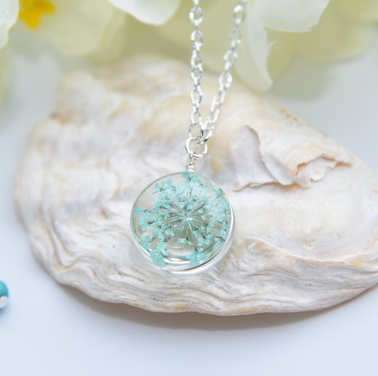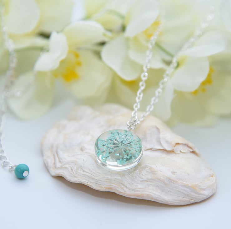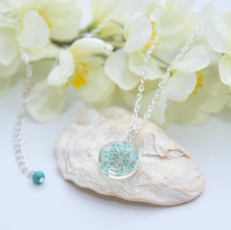 A gorgeous, pendant necklace featuring a pendant of pressed turquoise Queen Anne's Lace captured inside clear resin, set against silver chain and featuring a turquoise bead on the end of the extender chain.