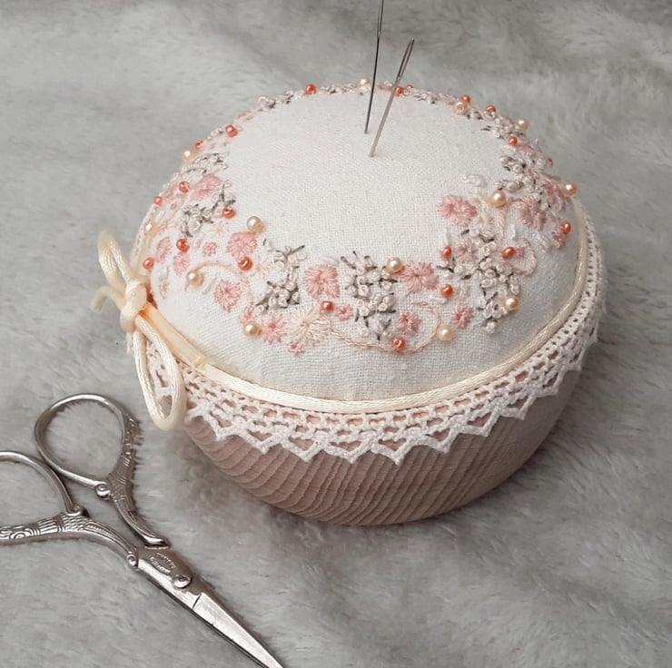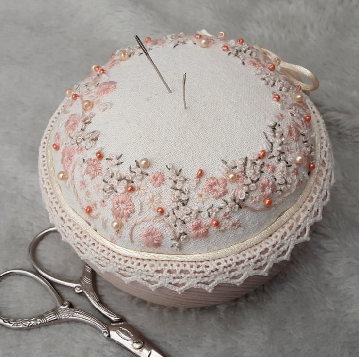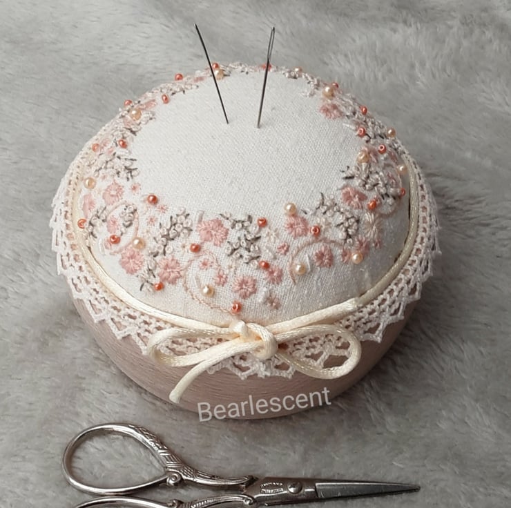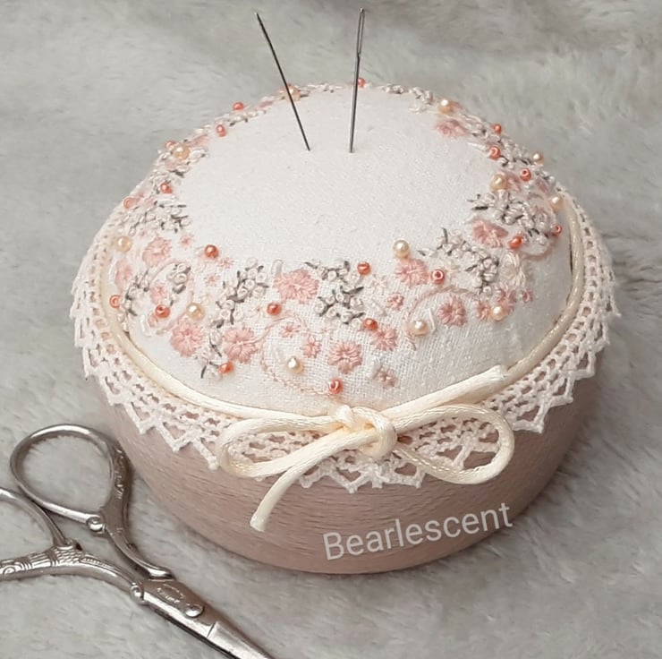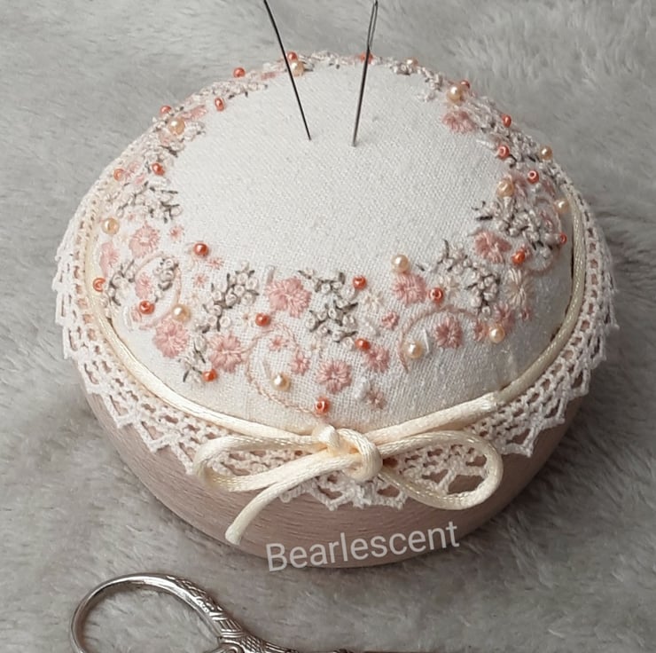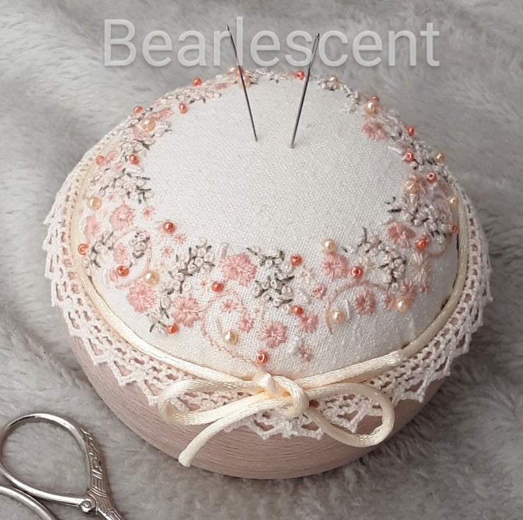 A hand embroidered, beaded pincushion in peaches and cream. A Unique design pin cushion created by Bearlescent