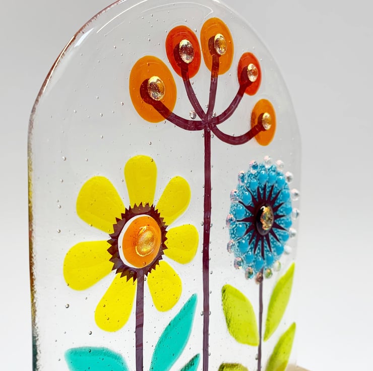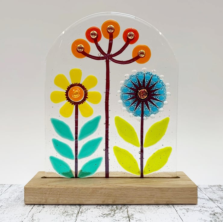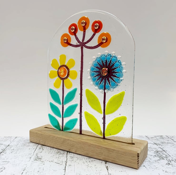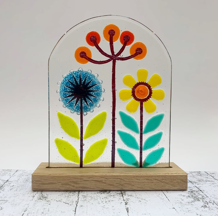 Fused glass freestanding piece on a solid oak base. I use Summery tones of yellow, orange and turquoise in my fused glass panel inspired by fennel, dandelions and daisies. This looks lovely either on a window sill with light flooding through it or on a mantelpiece. Each panel is completely unique.