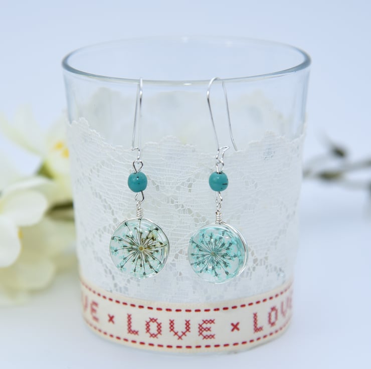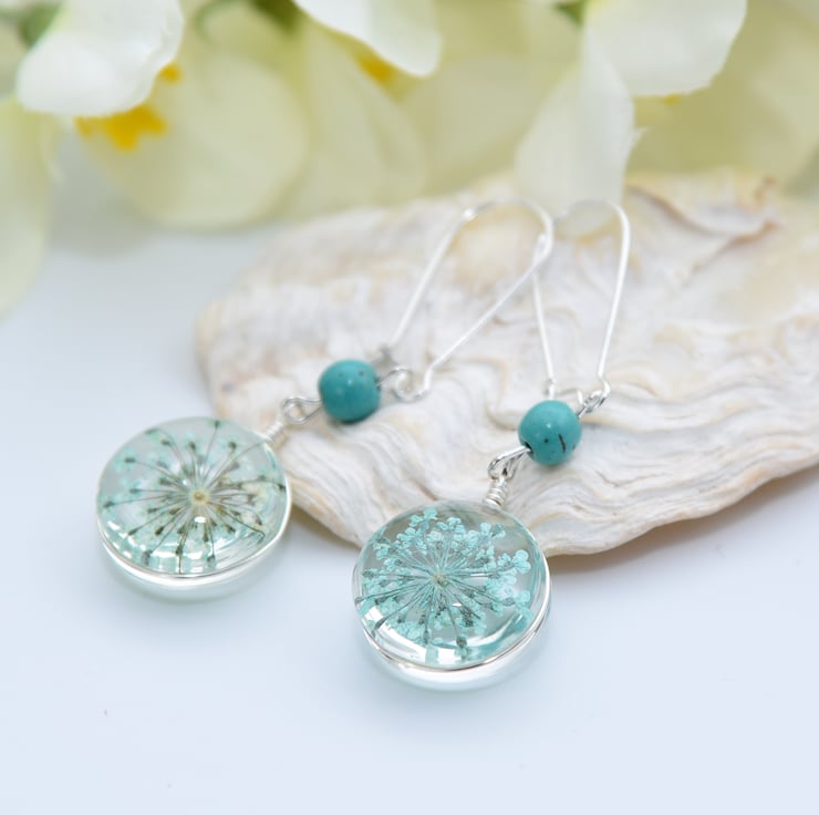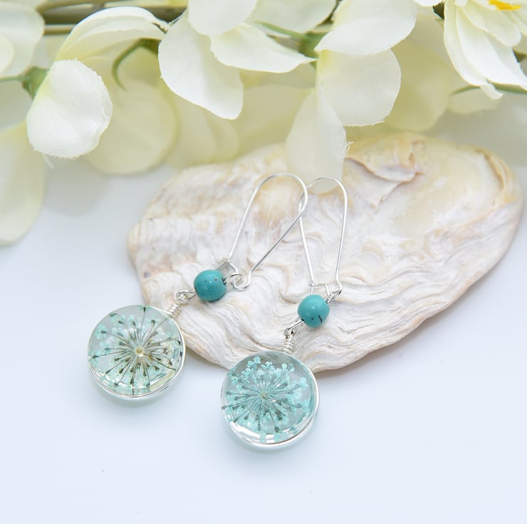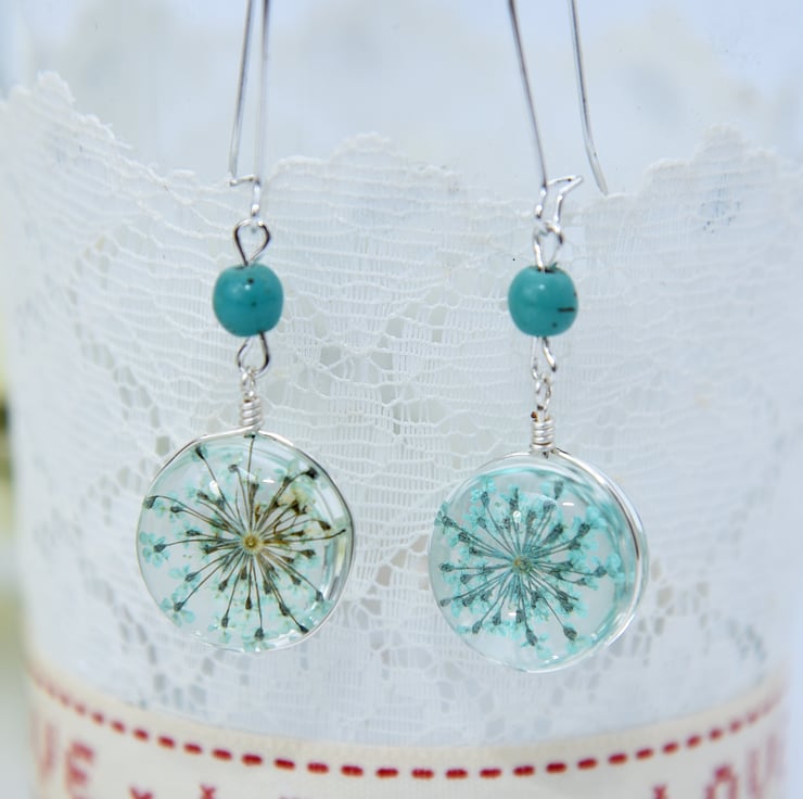 Long earrings with pressed turquoise Queen Anne's Lace flowers encased in resin with silver findings and Turquoise beads.