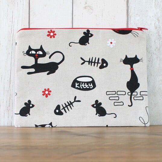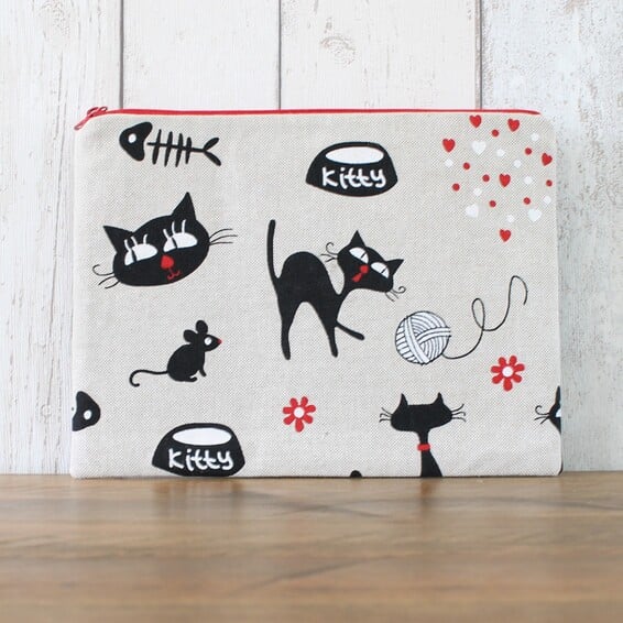 A zipped makeup bag in a cotton fabric with a retro black cat print on a linen coloured background. Lined with a coordinating cotton fabric, the makeup bag measures 24cm wide x 18cm wide.