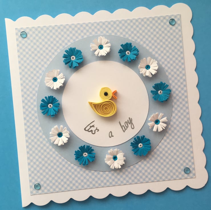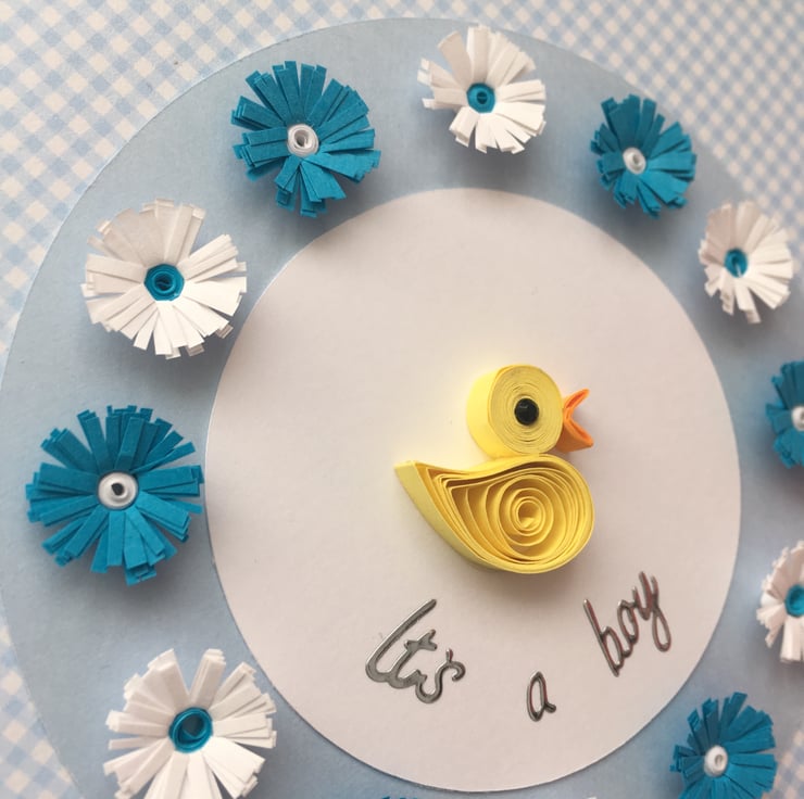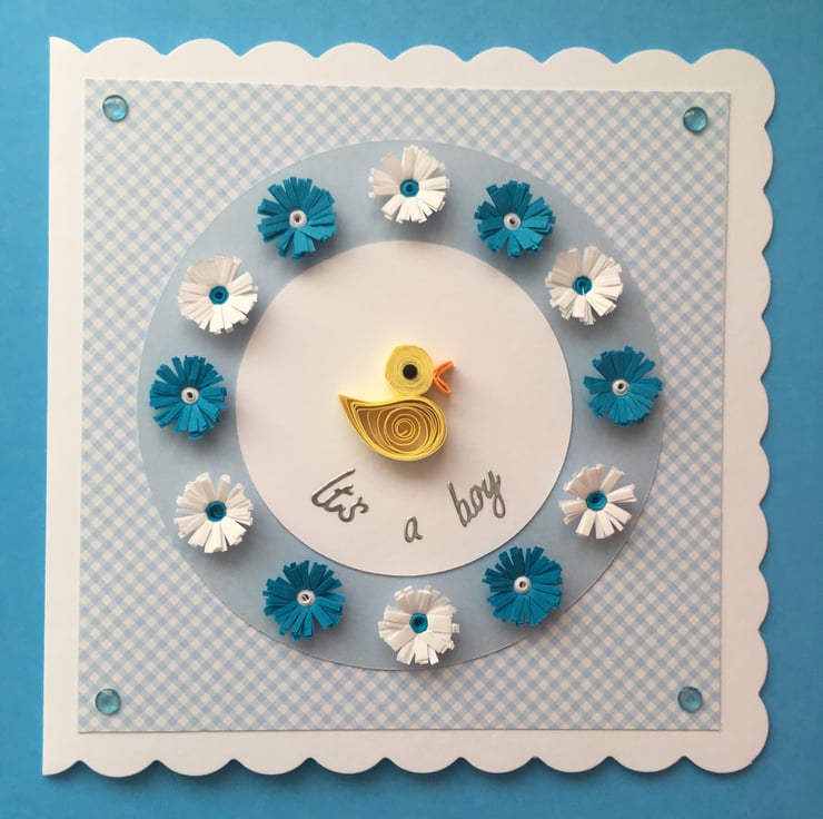 A beautifully-quilled card to celebrate the birth of a new baby boy.