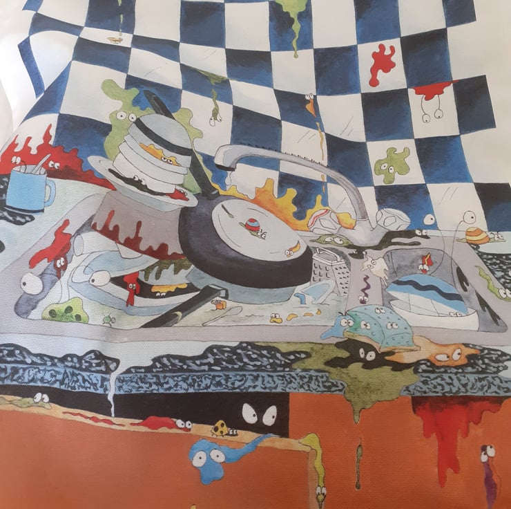 Illustrated cotton tea towel featuring slime monsters and snails emerging from a sink full of dishes.