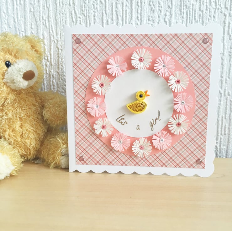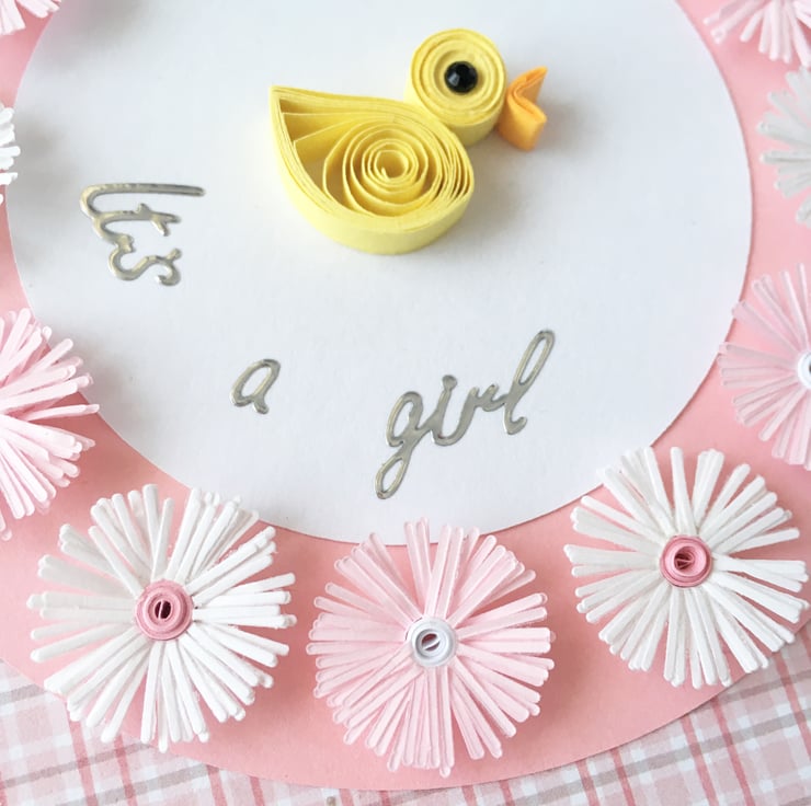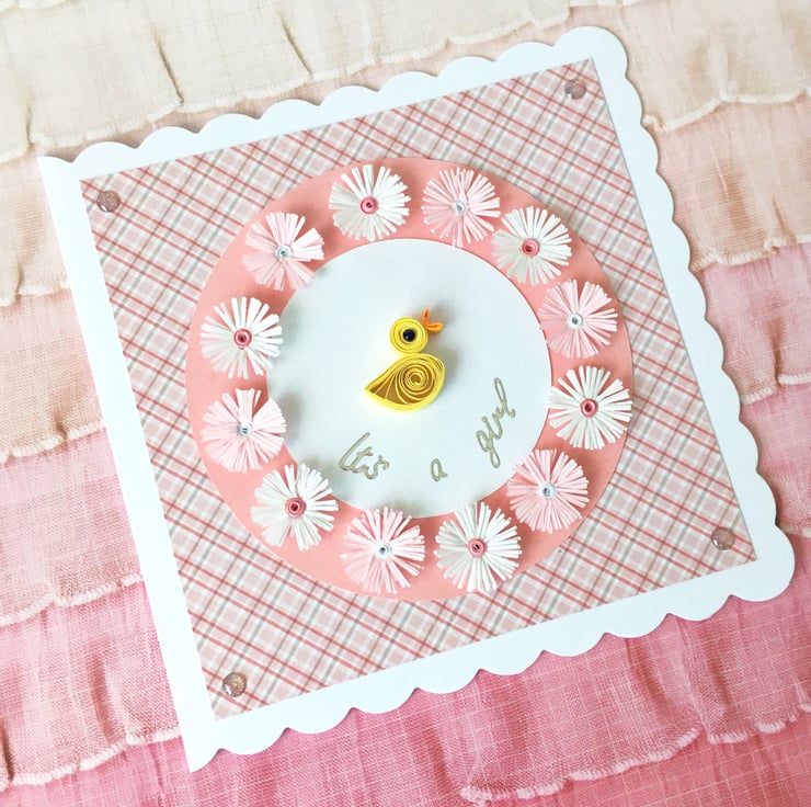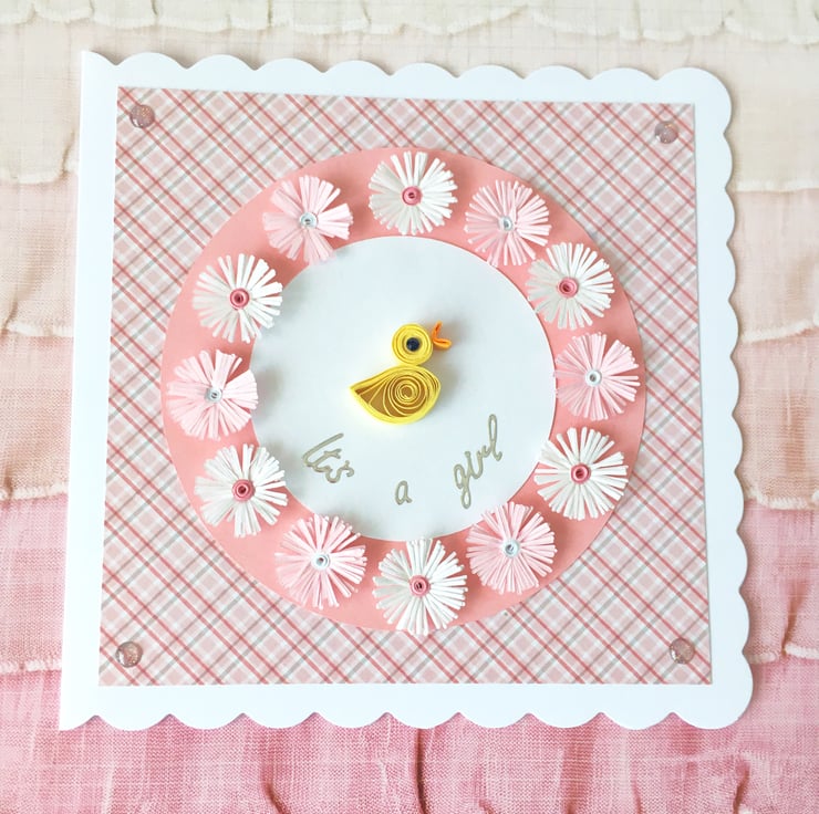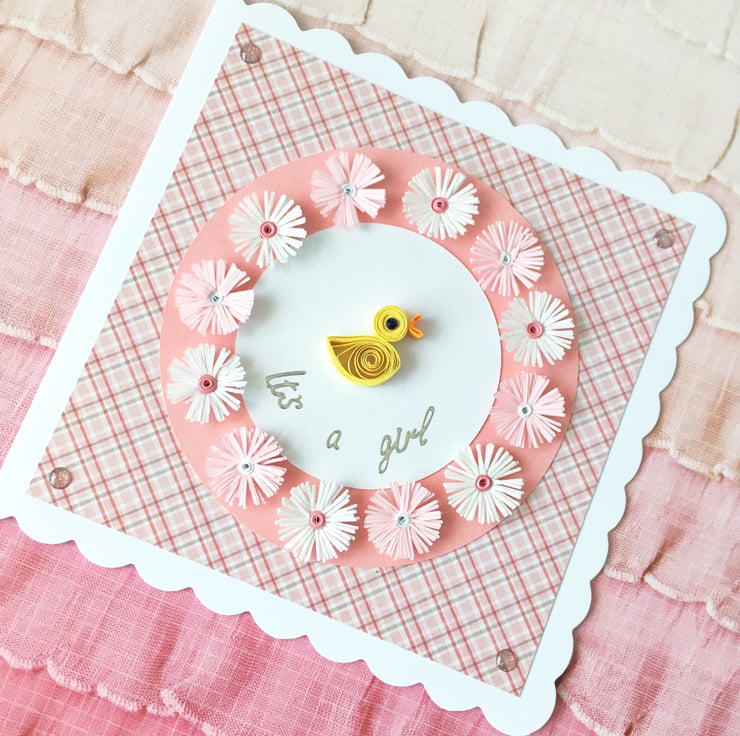 This scalloped card features a quilled yellow duckling encircled by pale pink and white flowers. There is a pink embellishement in each corner of the patterned background.