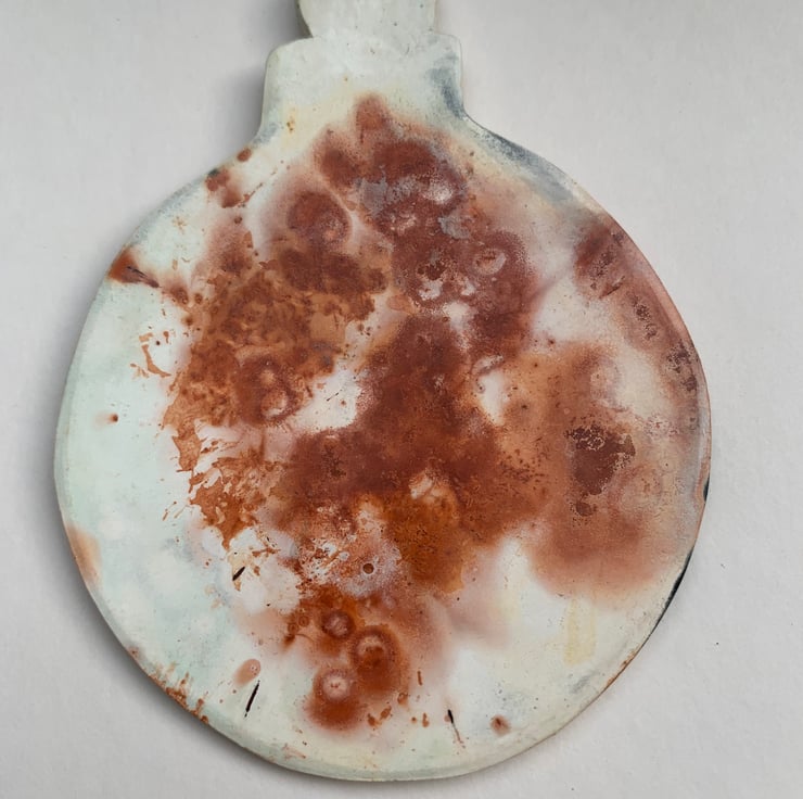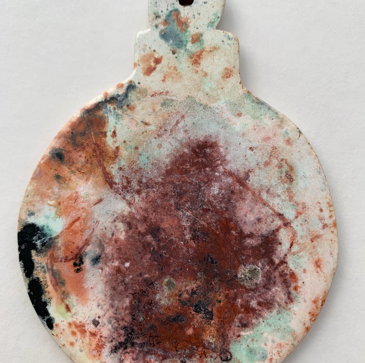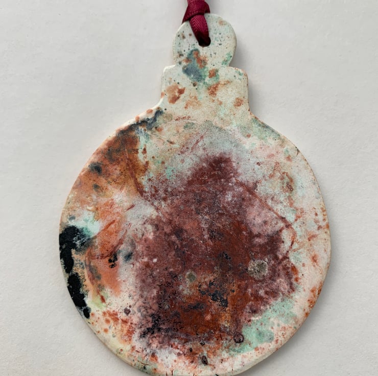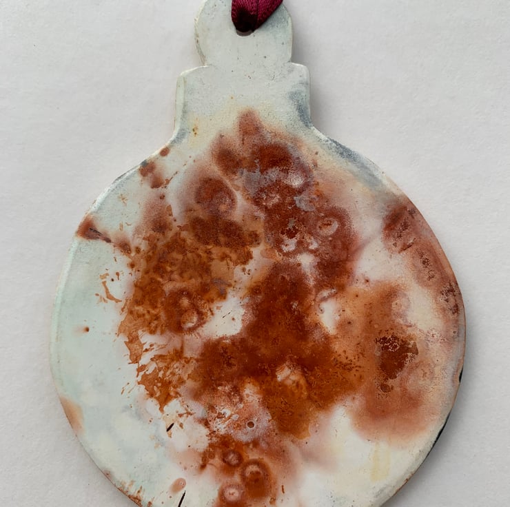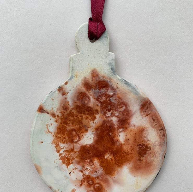The amazing marks on this porcelain bauble are created by firing the work in a pit. The decorations have been wrapped in copper wire, steel wire and salt soaked cloth; they are then placed in the pit with various organic materials including seaweed, banana skins, nut shells etc. The pit is then filled up with sawdust and wood and set alight. When the fire has reached enough temperature it creates a reaction with the organic materials and wire additions to produce the wonderful marks left on the clay. When it has burnt down it is covered and left overnight. It is incredibly exciting opening the pit the next day. Once unearthed, the decorations are scrubbed and then waxed to enhance the colours and seal the clay.