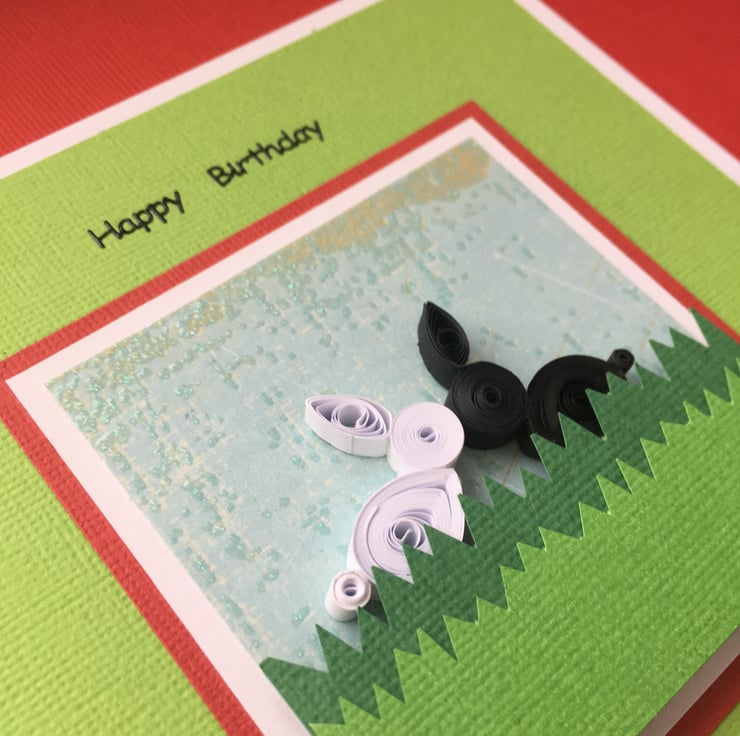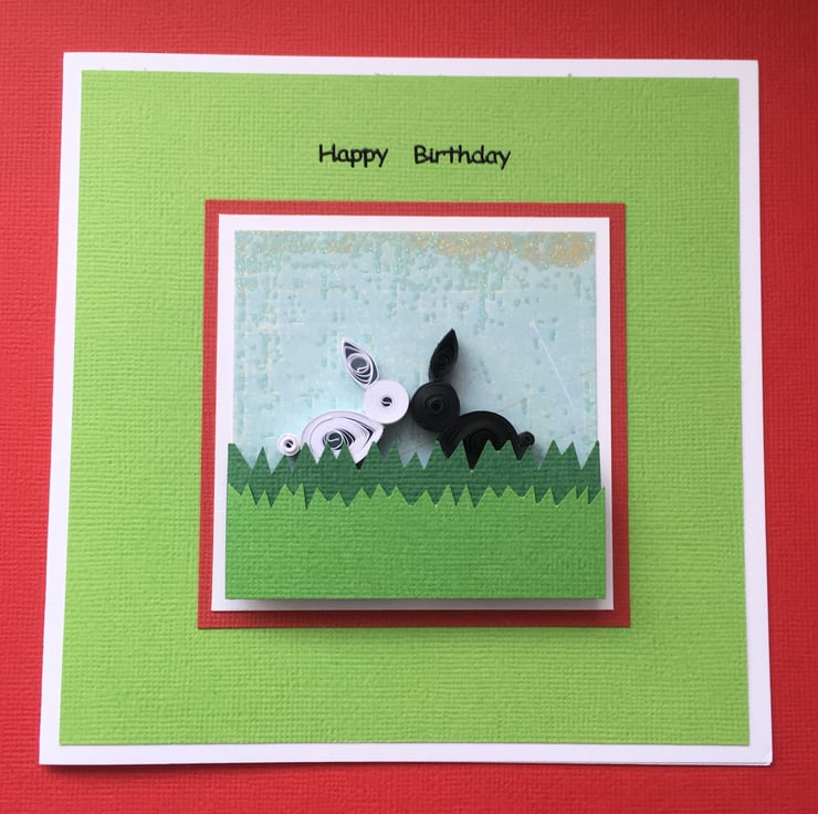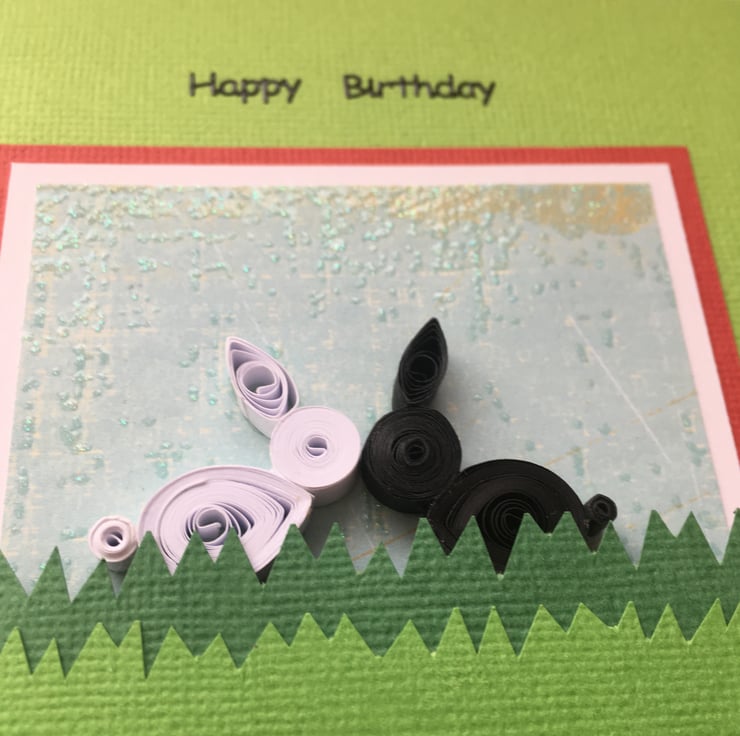 There are two hand-quilled rabbits – one black and one white – nose to nose in the spirit of friendship.