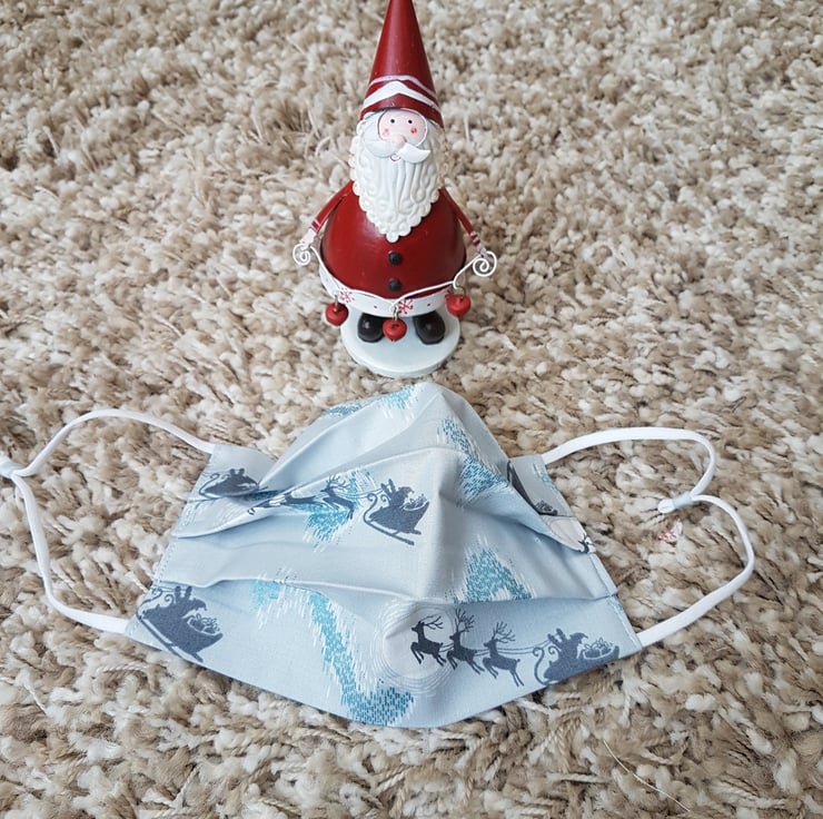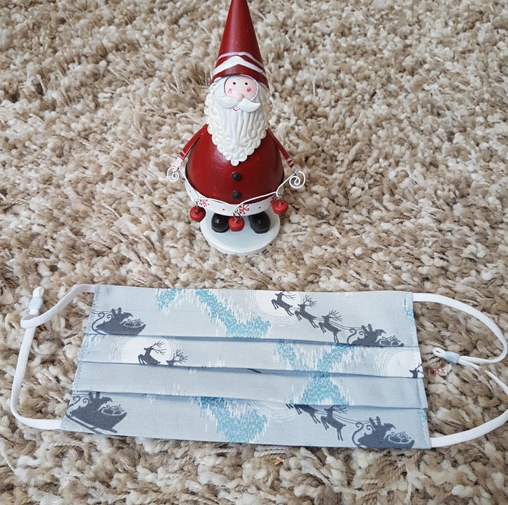 Small Adult/Teenager festive face covering made from a flying santa and reindeer print on a silver grey sparkly cotton. The face mask is made with 2 layers of cotton forming an inner pocket for a filter (not included) and is fastened over the ears with 2 loops of elastic and a toggle adjuster.