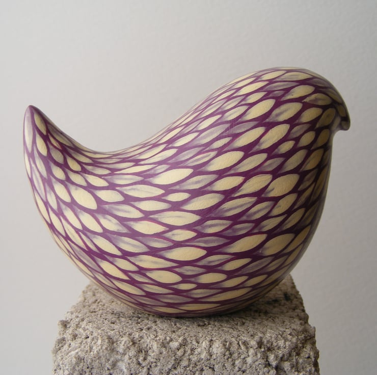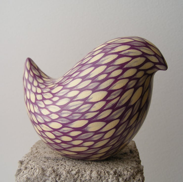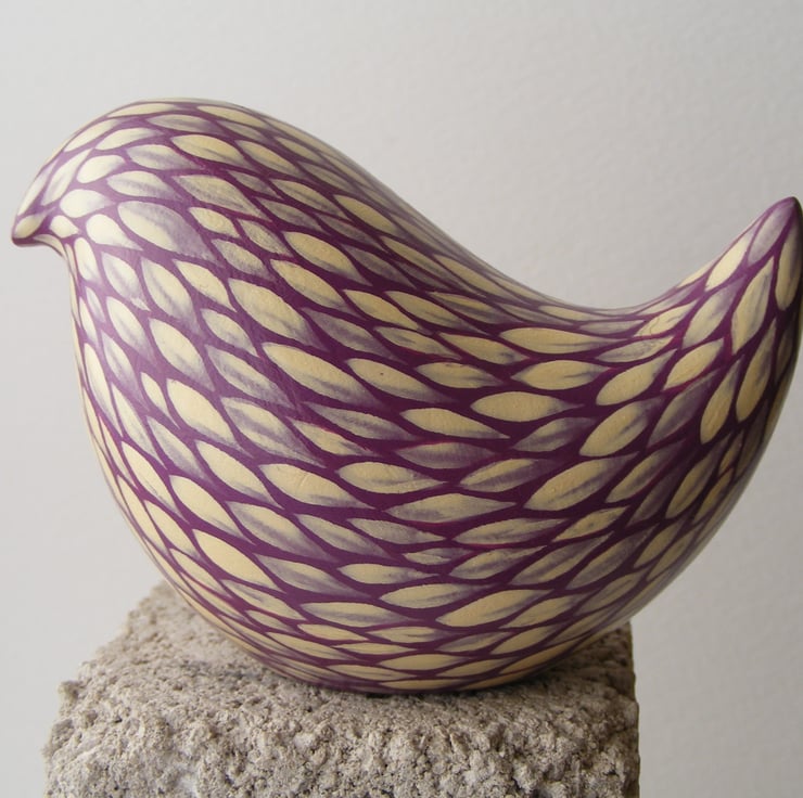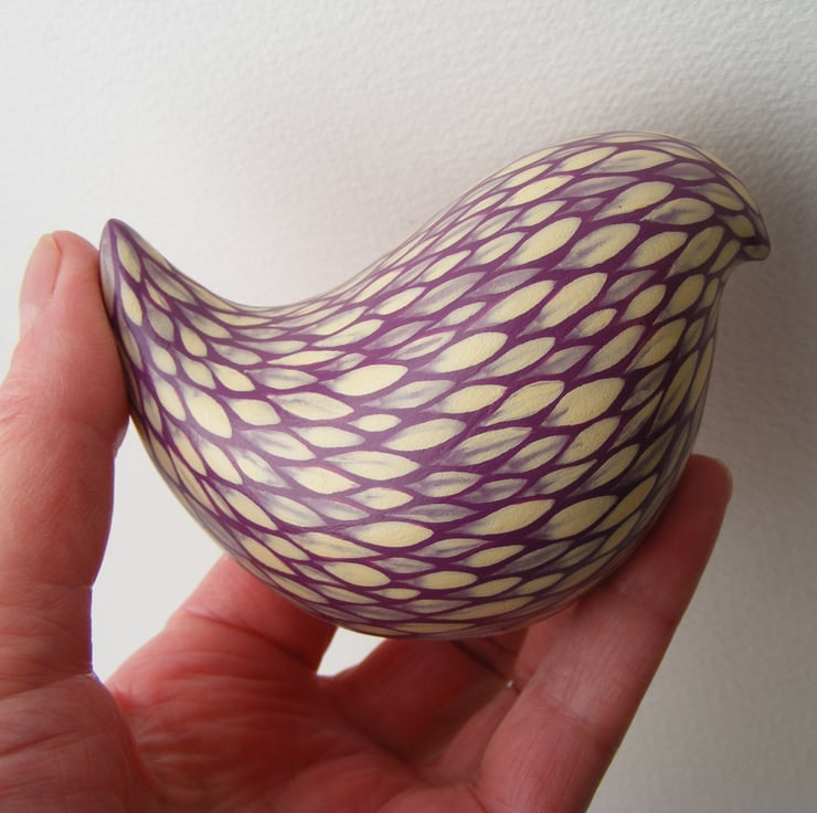 This painted bird measures 6cm high and 9cm long (2.5” x 3.5”) It is made from white earthenware clay. After firing I decorate the bird with acrylic paint, each feather mark is a single brush stroke. I used to paint folk art images on pots and out of all the animals I used I was fascinated with the plumage of colourful cockerels, so instead of painting a picture on the side of pots, I thought I would make a bird and tried to replicate the beautiful feathers with this painting technique that I have developed over the years. The bird has been varnished to protect the decoration. As this is a painted item please keep out of strong sunlight for prolonged amounts of time.