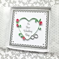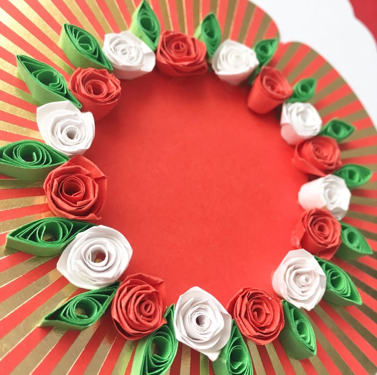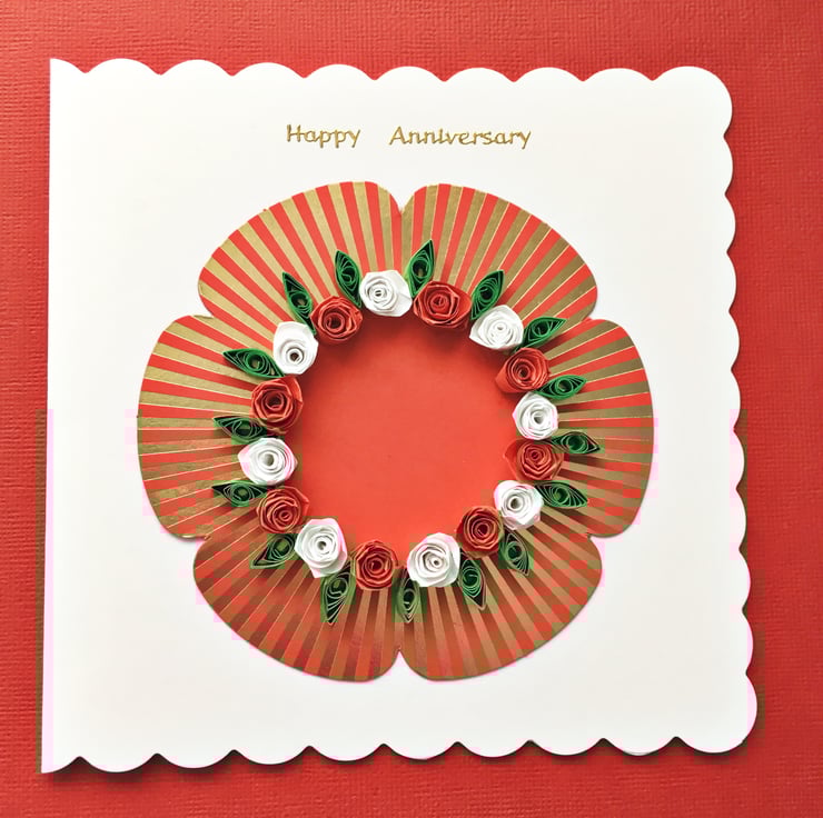 This is a beautiful anniversary card featuring red and white hand-quilled roses on a gold-foiled background.