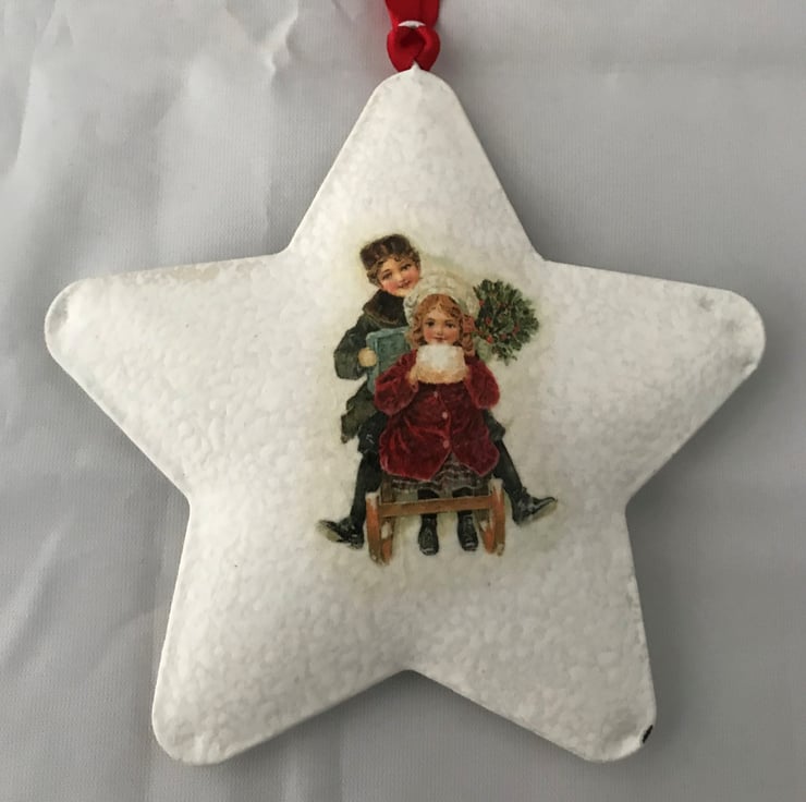 I have painted and then decorated with rice paper images, three small metal stars, two of which depict vintage children and the other has a smiling Santa.