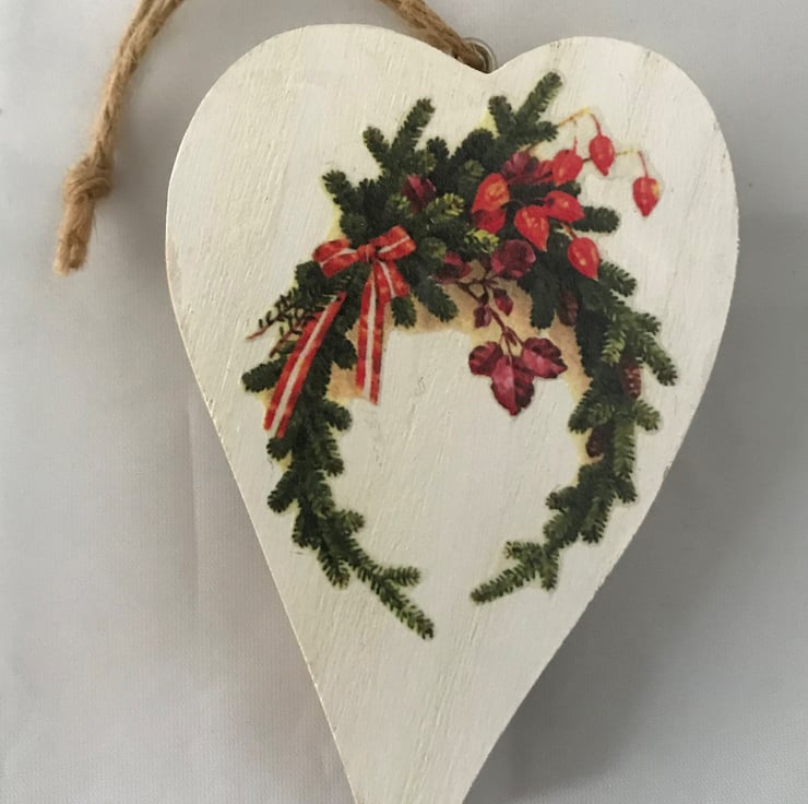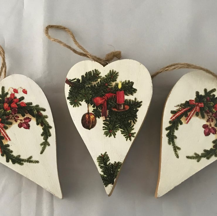 These unusual wooden hearts, with the tree bark on the reverse, have been painted and then decorated with charming rice paper images of vintage Christmas greenery.
