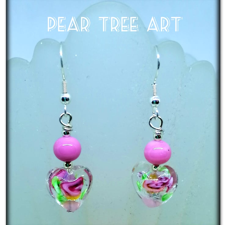 Murano glass pink flower heart drop bead earrings on Silver plated hooks.