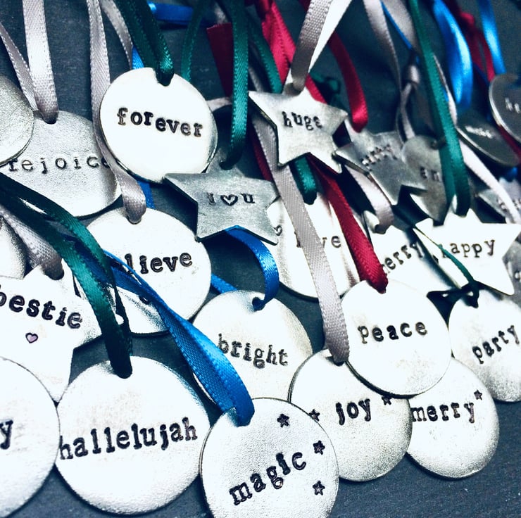 Personalise your tree decoration with a single word or name, please note that the stars only carry up to 7 characters, but the discs can hold up to 10. You can leave details of your wording choice and ribbon colour at checkout.