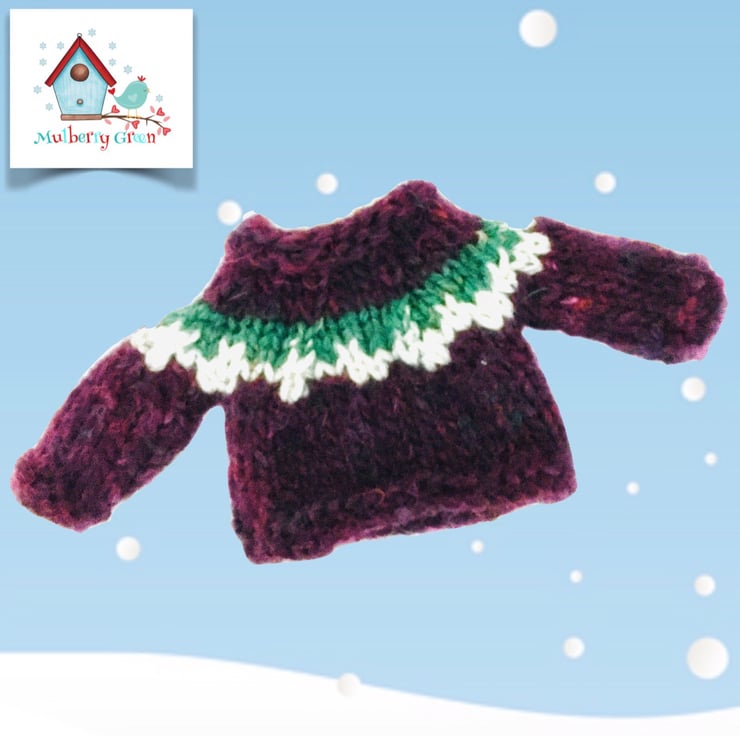 A cosy and warm maroon jumper, handknitted in Icelandic Lopi 100% Icelandic wool, made especially to fit the Mulberry Green dolls. It has a patterned yoke and comes on a little wooden hanger. It matches the maroon and dark green kilt.