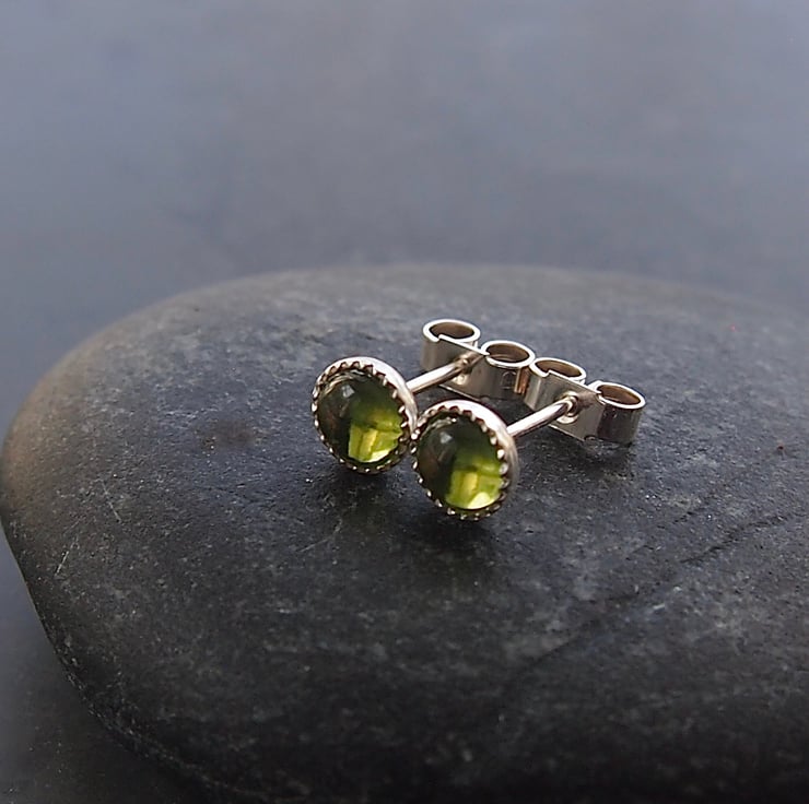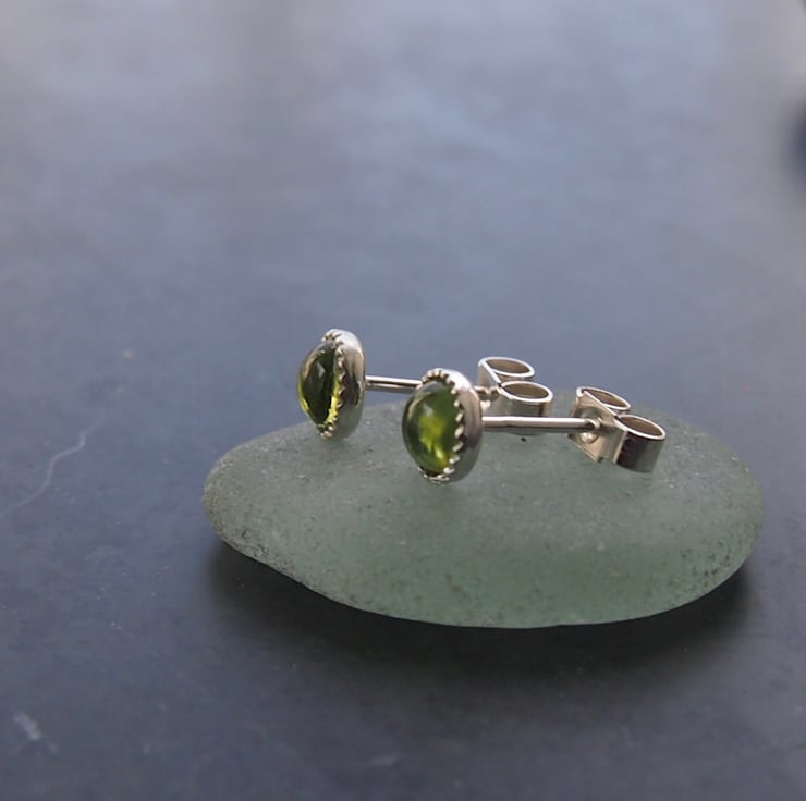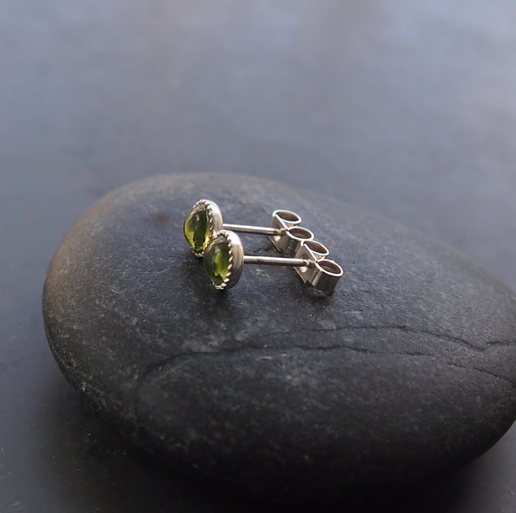 Sterling silver studs with a decorative edge and set with a 5mm peridot cabochon. Simple and neat for everyday wear with a pop of colour.