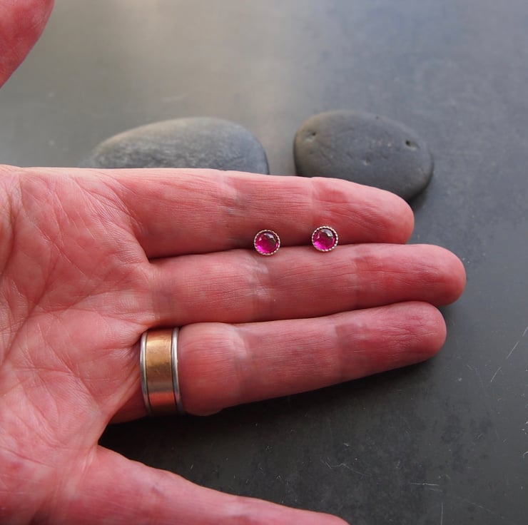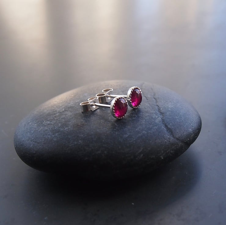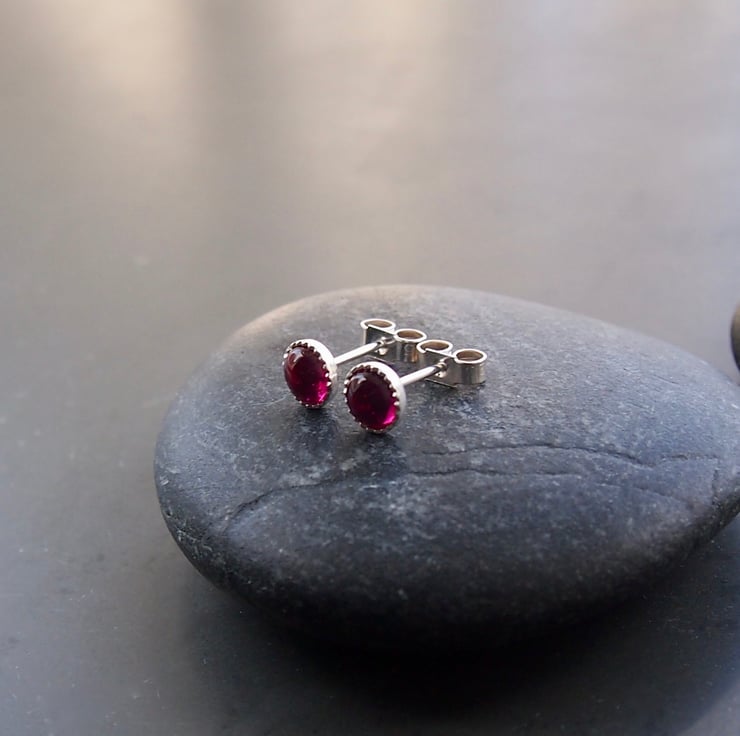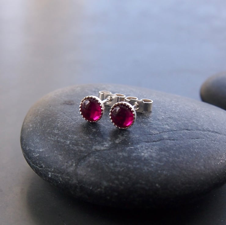 Sterling silver studs with a decorative edge and set with a 5mm synthetic ruby cabochon. Simple and neat for everyday wear with a pop of colour.