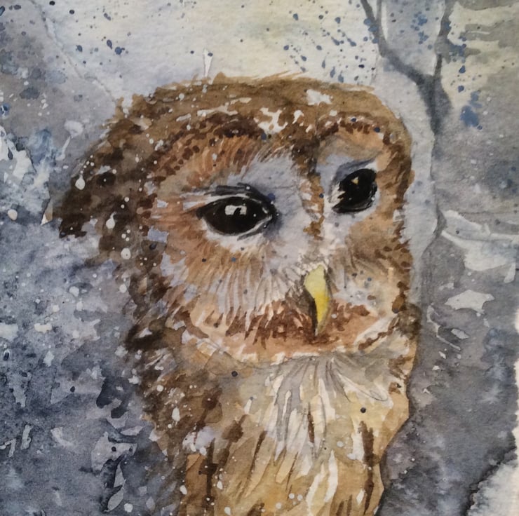 I love making one off cards so the recipient receives a card that is completely unique which hopefully makes them feel very special! I successfully sell my artwork online and in a local craft shop.This hand painted Christmas card consists of an original watercolour painting and not a print. The painting has been painted on watercolour paper and mounted before being attached to a kraft card so after it has been displayed the painting can be framed as an original piece of artwork. The card depicts an owl in snow and is a perfect representation of my style of artwork . I use a range of watercolour techniques to create my unique style such as wet on wet and resist.The card has been left blank inside for your own personal message and comes with an envelope. The measurements are approximately 13.5cm x 13.5cm.Thank you for looking at my work.