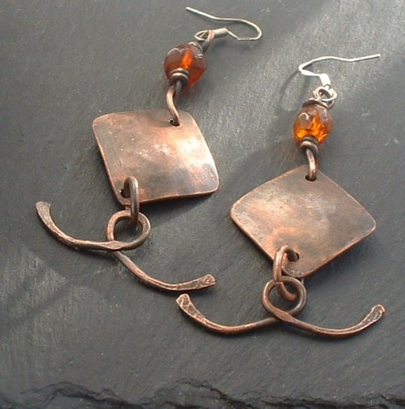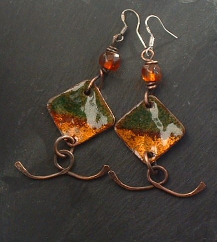 Made from recycled copper plate which was cut to shape and layered with gold and green enamel powder then torch fired to fuse to the metal. A wire wrapped amber bead complements the colours of the enamel and twisted pieces of copper wire "tails" add extra length and give them a lovely movement.