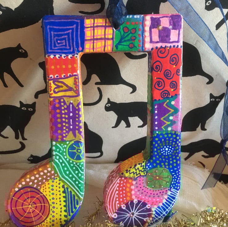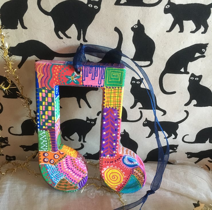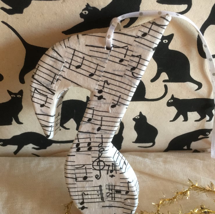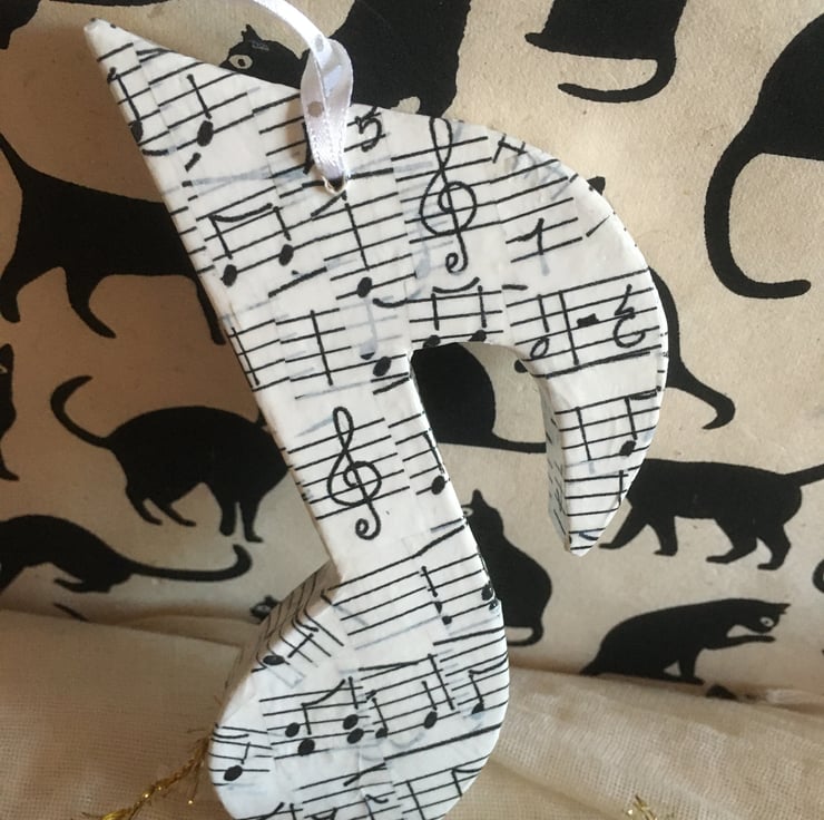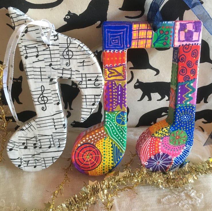 2 musical notes are included in this sale. These musical notes are paper mache and single note is decorated with musical Decopatched papers and varnished. It hangs by a silver dotty ribbon.