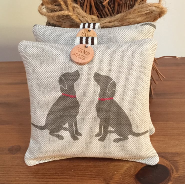 A hanging Lavender sachet constructed from a delightful brown Labrador linen fabric and backed with a natural coloured linen . Embellished with a ' Hand Made' wooden tag. Generously filled with fragrant Cotswold lavender . A lovely item perfect to fragrance wardrobes , drawers, boot/ utility rooms or alternatively just hang as a decorative item in your home.