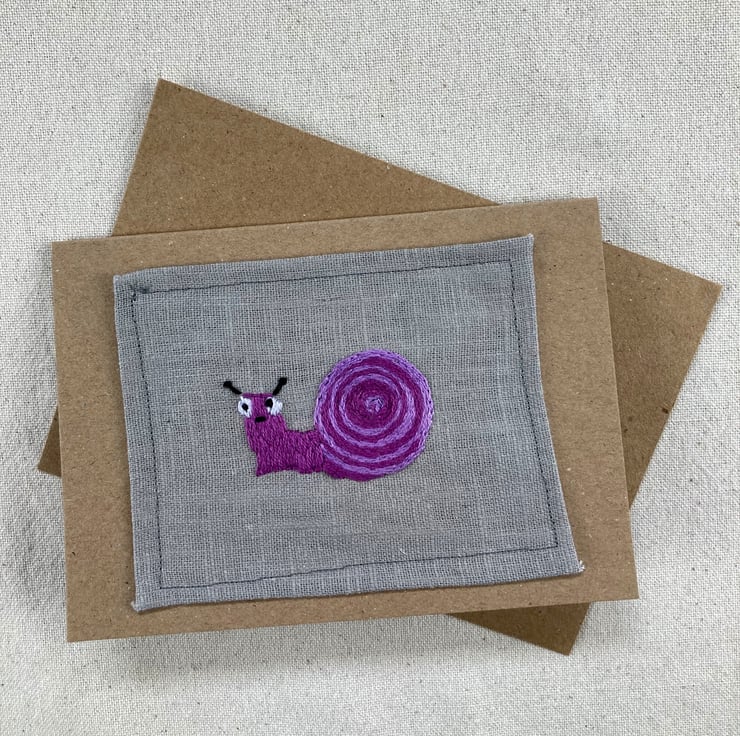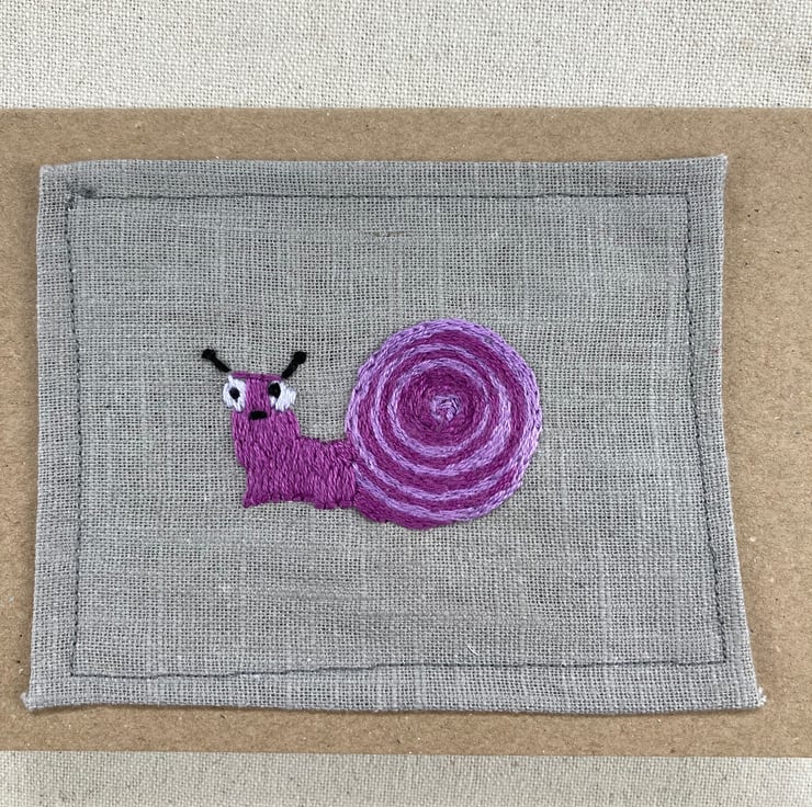 This little, slightly googly eyed snail is hand embroidered onto linen. He is set onto a card, size 10.4 cm x 14.7 cm and the inside of the card is left blank for your own message.