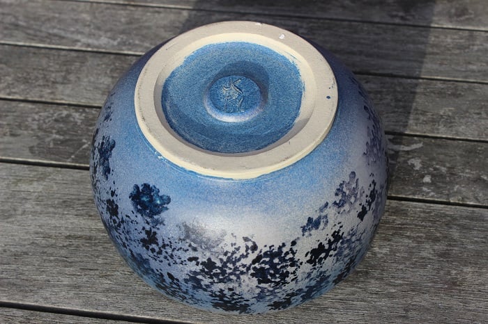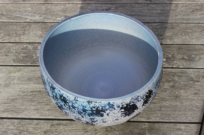 A wheel thrown stoneware bowl, the background being pale blue with the outside decorated in dark blue.