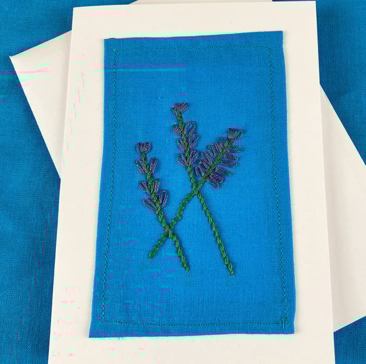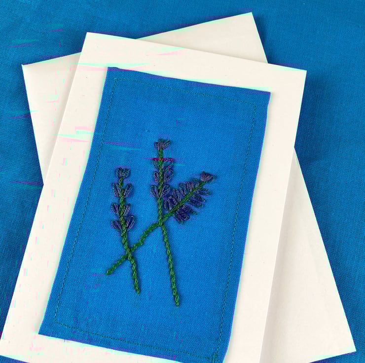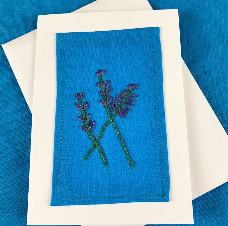 Three hand embroidered lavender stems on blue cotton, mounted onto a white card with matching envelope. Card size: 10.5 cm x 14.7 cm. The inside of the card is blank for your own message.