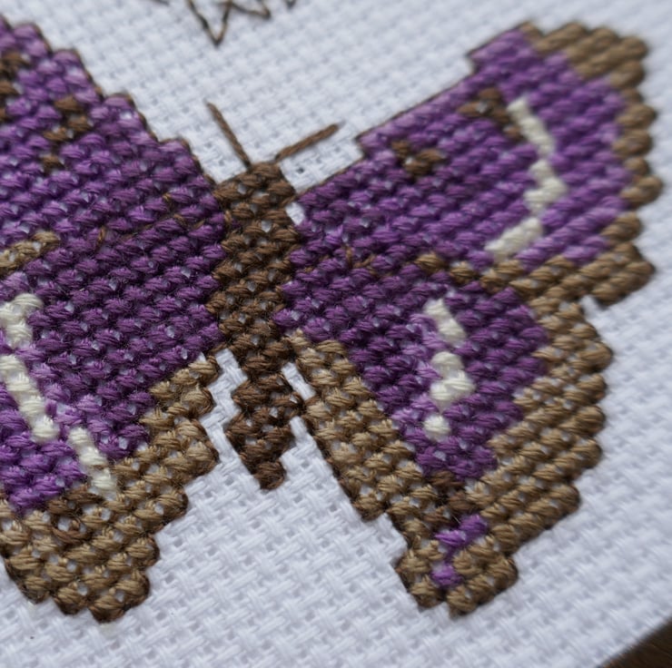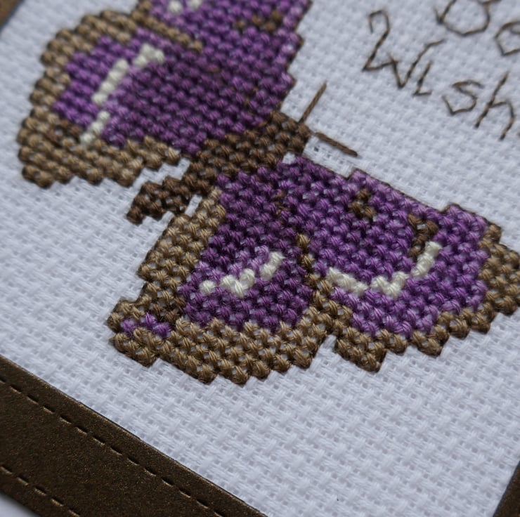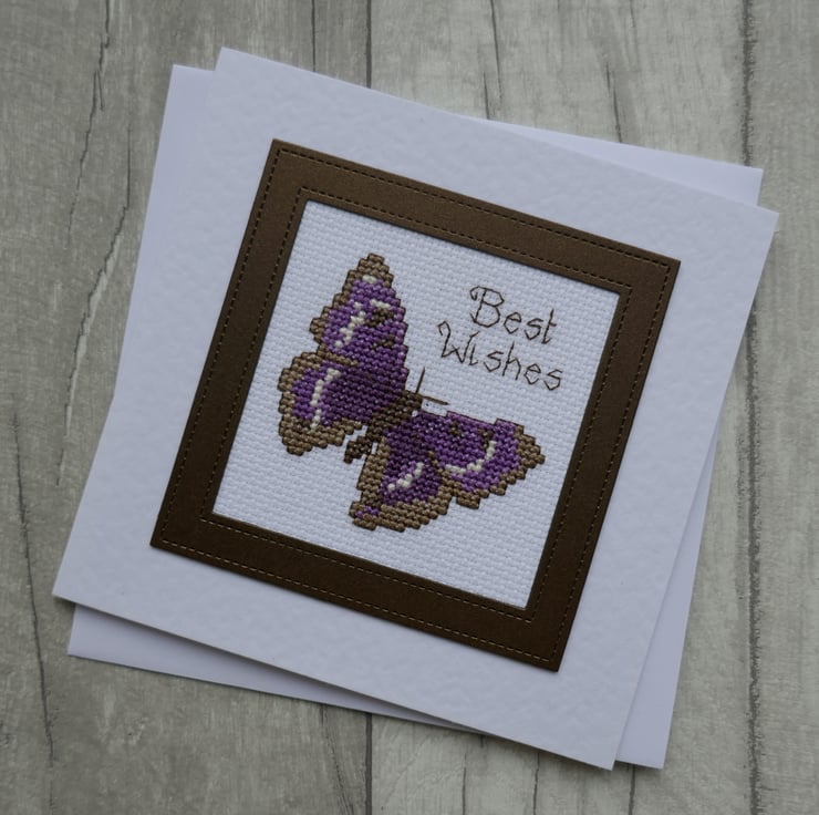 The card measures approximately 6" x 6" and is made from white hammer card. The Purple Emperor butterfly is from a design by Jane Greenoff. It has been stitched on white aida in shades of brown, purple and cream. The butterfly has been outlined in dark brown thread which has also been used to stitch 'Best Wishes'. The cross stitch has been mounted behind a dark brown pearlescent card frame that matches the colour of the butterfly. The back of the card is stamped 'Handmade by Kath'.
