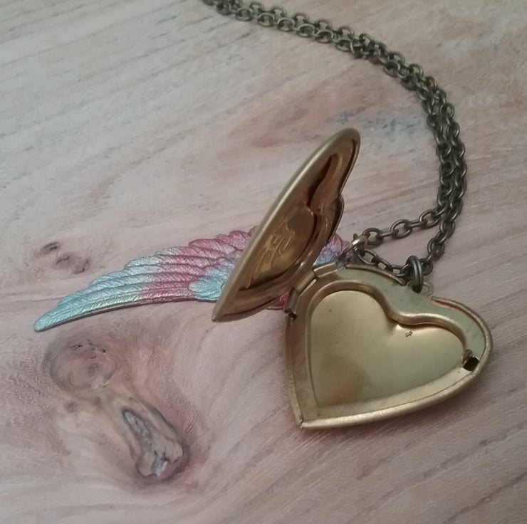 Raw brass heart locket message says I LOVE YOU and professionally hand painted wing.