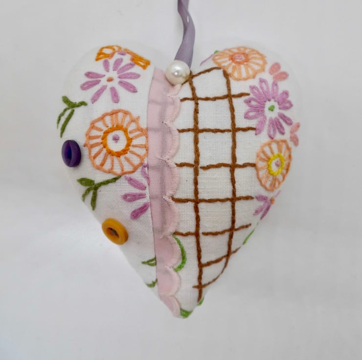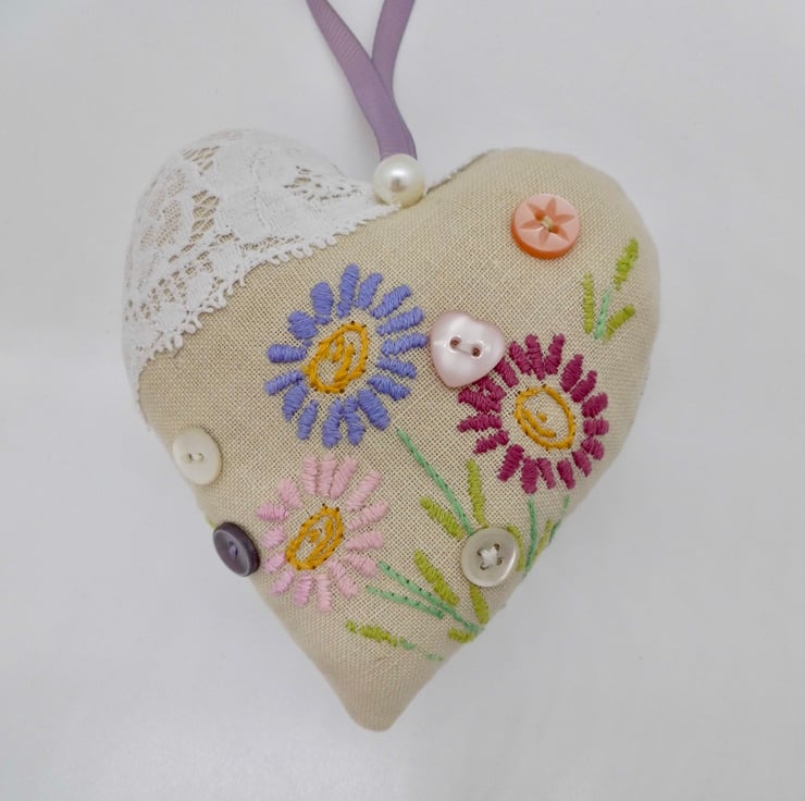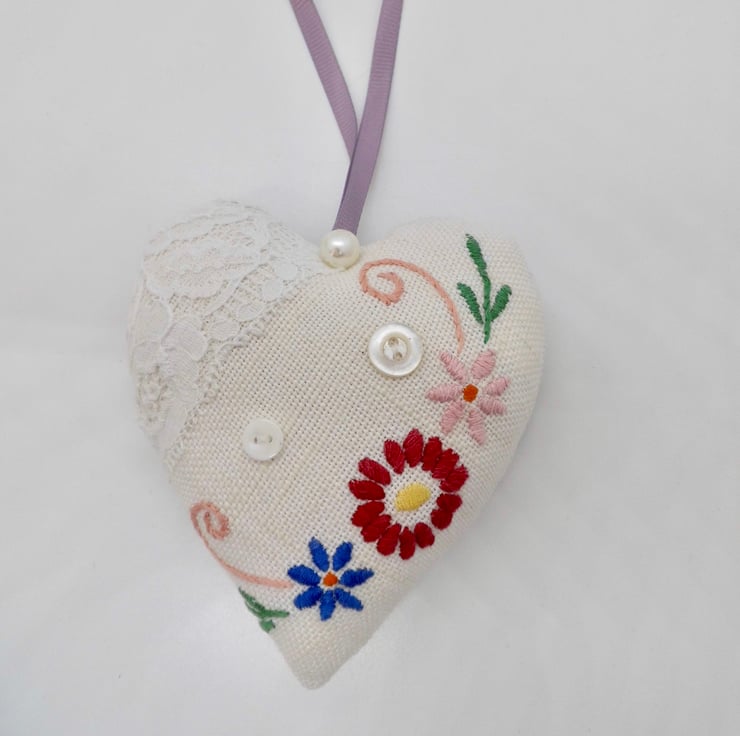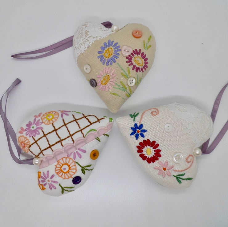 Three hearts featuring pretty embroidered flowers snipped from the remains of vintage linens and with vintage buttons and lace for decoration. Backs made from various fabric, please see photos. Shabby-chic in style.
