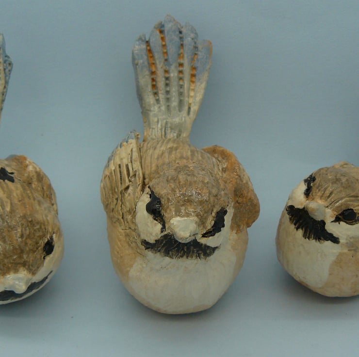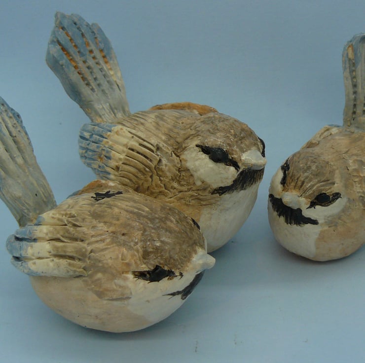 Clay small Wrenr 10 x 7 cms. Made by the pinched pot method. Painted with coloured slips.