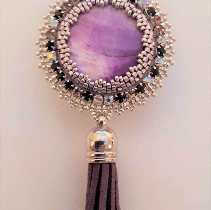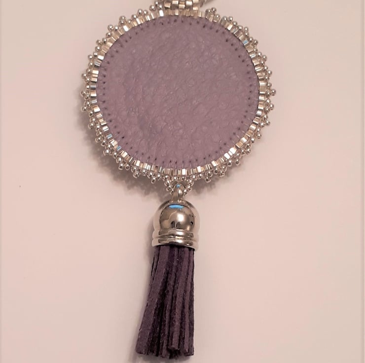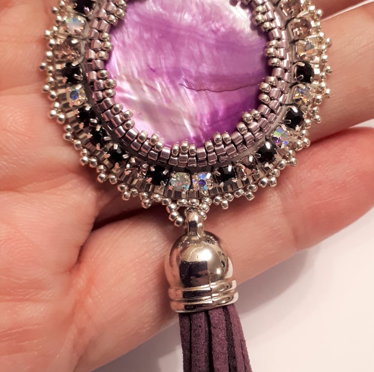 The centre of this pendant is made of dyed purple shell and is surrounded with pale purple metallic and silver seed beads and purple, pink and white AB crystal cup chain. It is finished off with a border of tiny seed beads and a purple suede tassels. The pendant is approx 3.5"/ 8.5 cm long from the top of the bail to the bottom of the tassel and is approx. 1.5"/4.5 cm wide. It is backed with lilac leather and hangs on 20"/50cm long silver tone chain which fastens with a silver tone trigger clasp. Chain can be changed to a shorter length if required