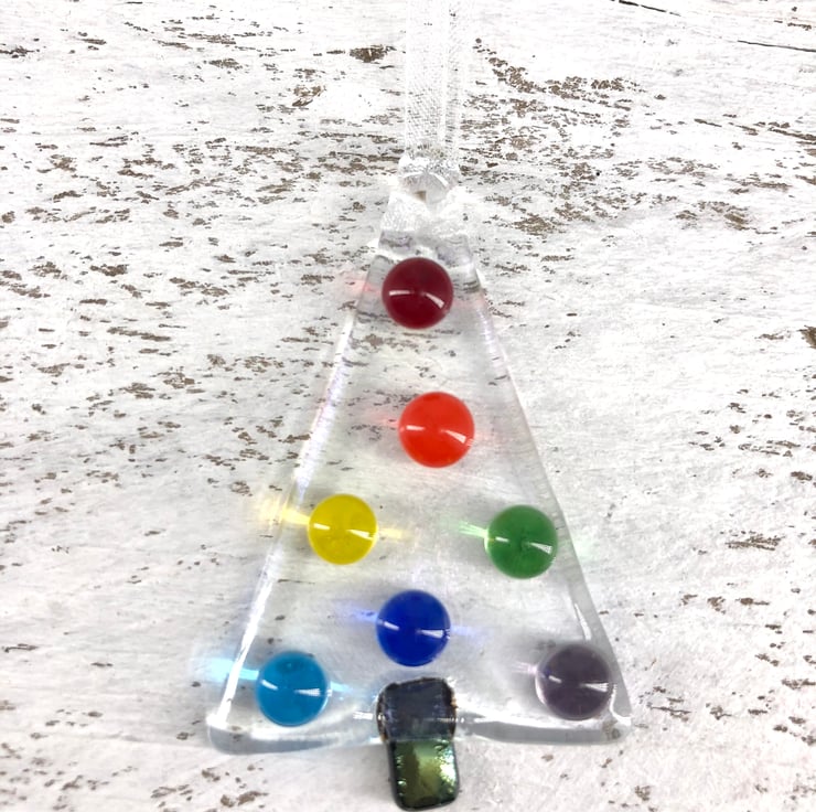 The tree is made from shimmery iridescent clear Glass with baubles in all the colours of the rainbow and a silver one on the top. The piece measures approx. 4 x 6.5cm and comes on a length of white organza for hanging.