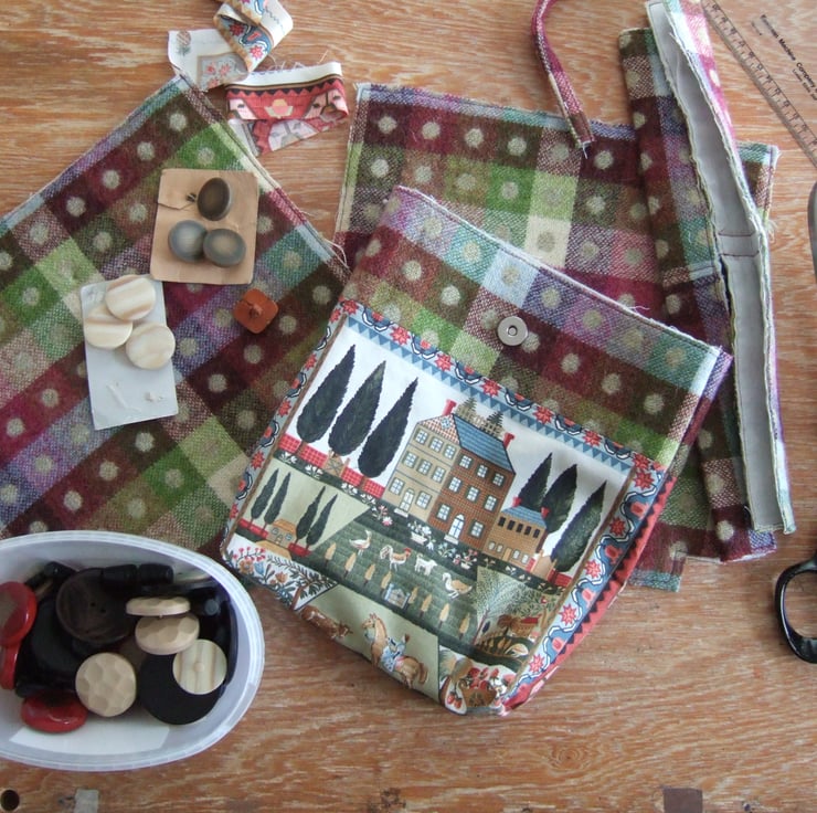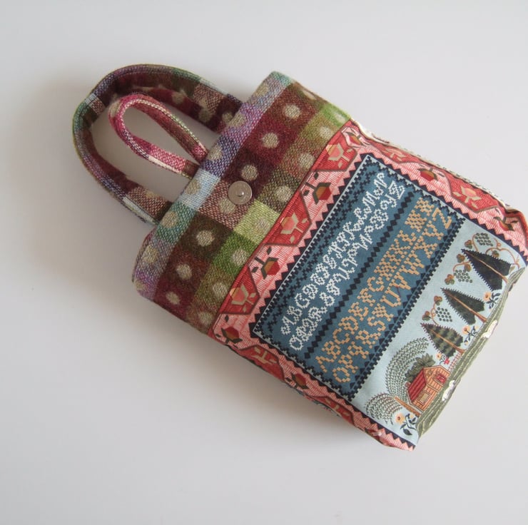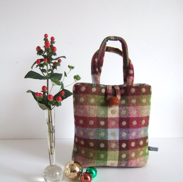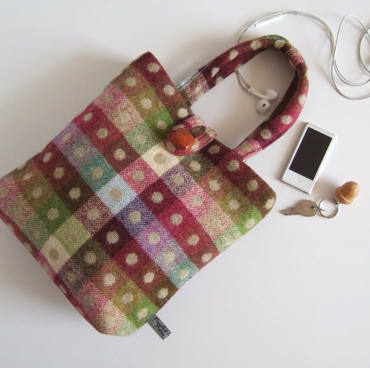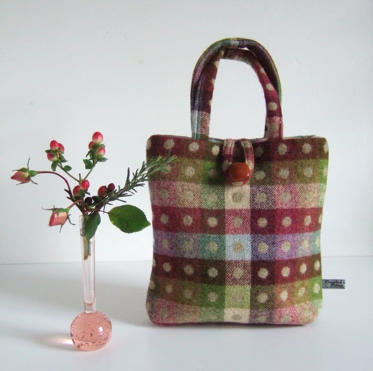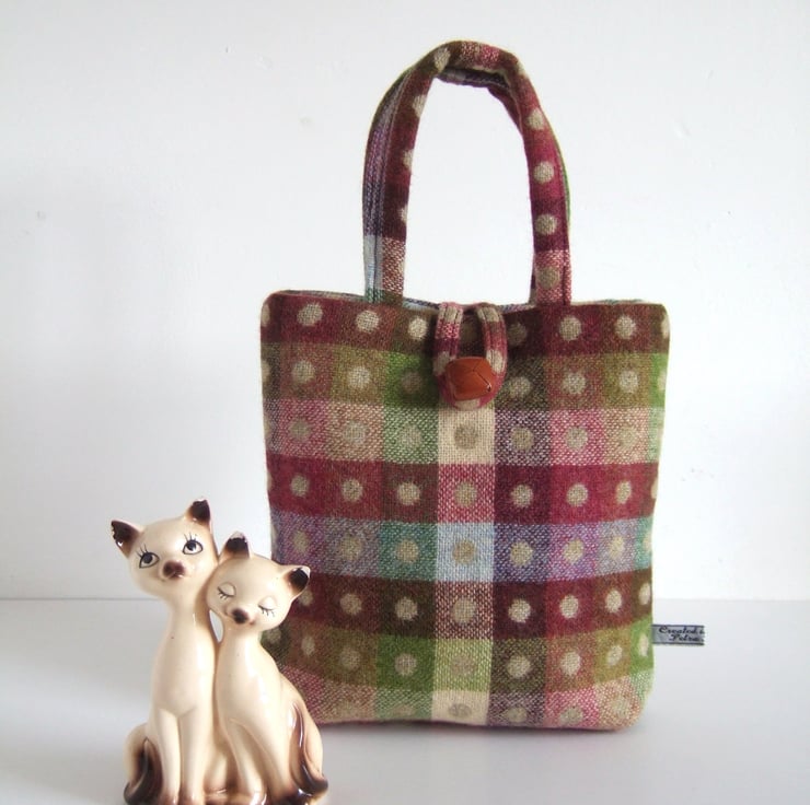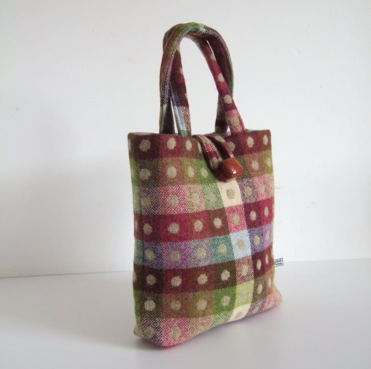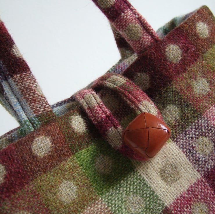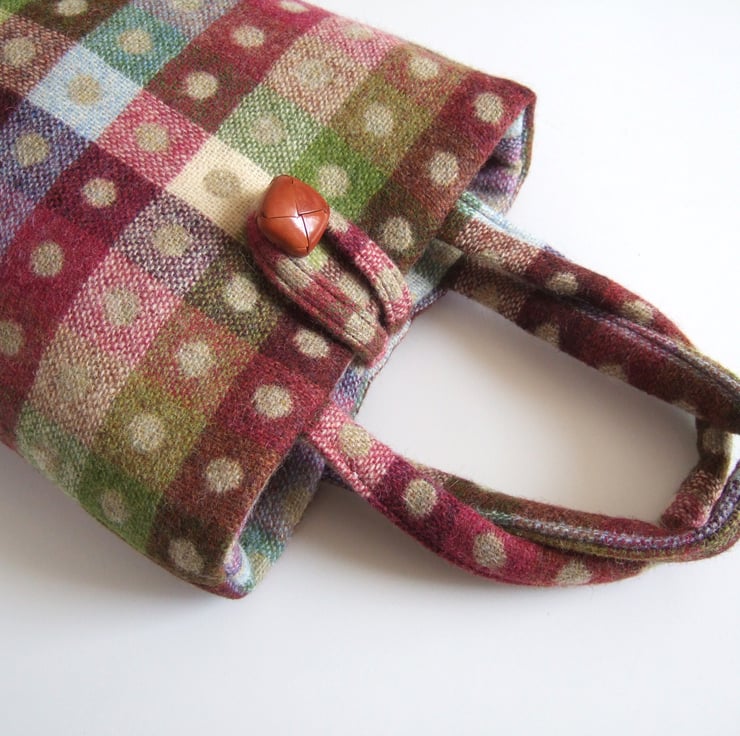 This lovely woollen remnant was just large enough to squeeze out this cute but practical little bucket bag. It is woven in a beautiful, muted, autumn winter colour scheme, and with a design of checks AND dots, whats not to like? It would make a great present for a winter birthday, for a best friend at Christmas, or as a treat for yourself.
