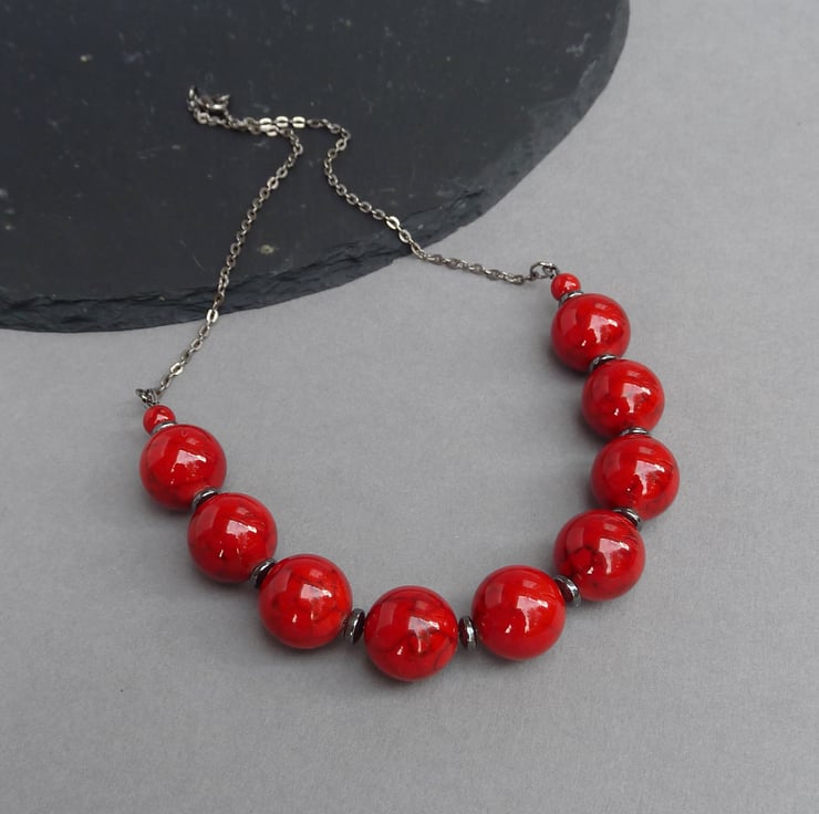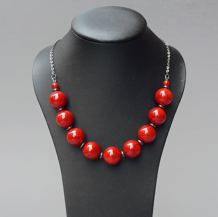 Each 16mm scarlet red bead used to make this chunky bright red necklace has a lovely, black veining and a glossy, glass-like finish. The red coloured stone beads are teamed with dark grey hematite beads. This striking necklace is ideal for making a statement and adding a pop of colour to your outfit.