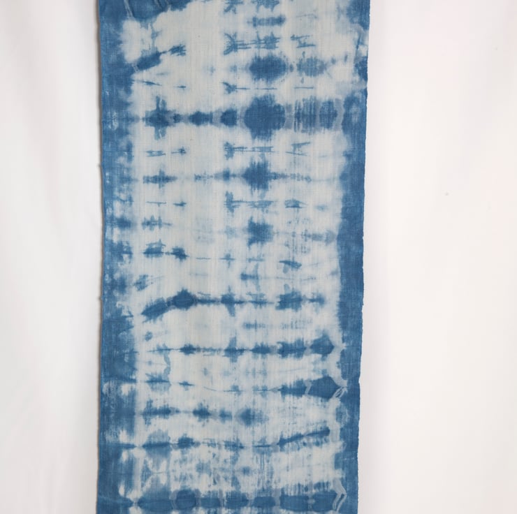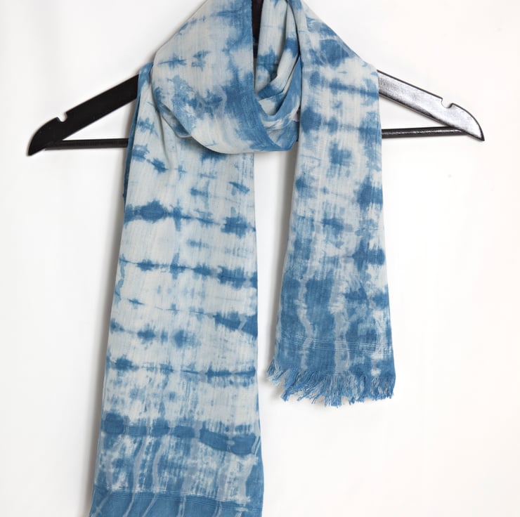 A unique organic cotton indigo dyed scarf. Shibori techniques used to create interesting patterns across the scarf, resulting in a beautiful textured blue & white pattern, which is completely unique. No two scarves are the same.