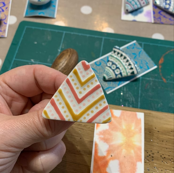Next to the fun bit, applying colour! I hand paint each brooch using a complimentary coloured underglazes. Before dipping in a glossy transparent glaze and firing for the final time. A brooch pin is then attached to each piece and ta-da it’s ready to wear!