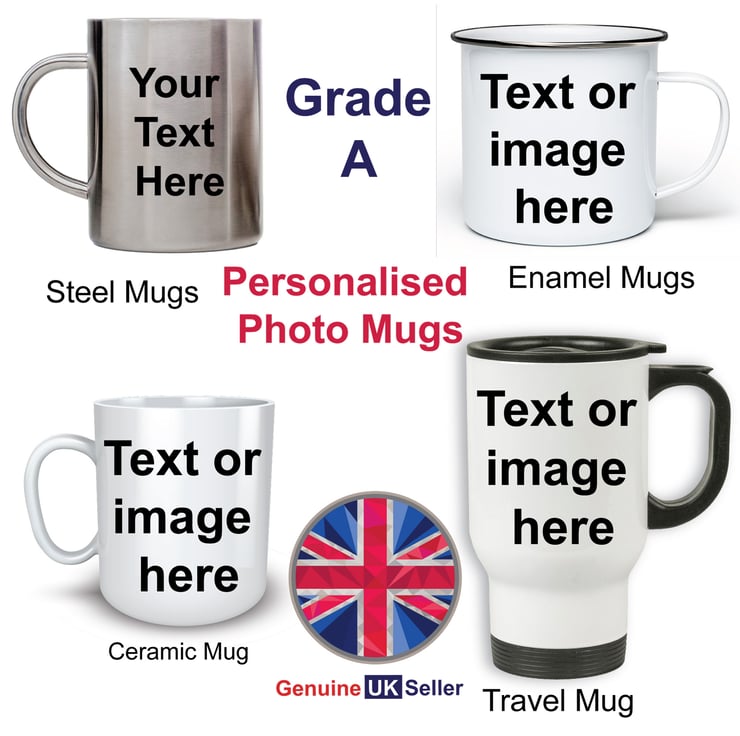 PERSONALISED MUG, PHOTO MUG, CUSTOM DESIGN YOUR OWN TEXT IMAGE LOGO Printed by us Aggies Bags the mug is a great gift to give for birthdays Christmas and many more special occasions We have all classic styles stainless white travel mug, Large Handle 11oz Ceramic mug, Enamel Stainless Steel Rim mug, Enamel Whitel Rim mug, 10oz Steel Mug, 11oz Ceramic Magic Colour Change Mug, Photo Mug, Printed Both Sides,
