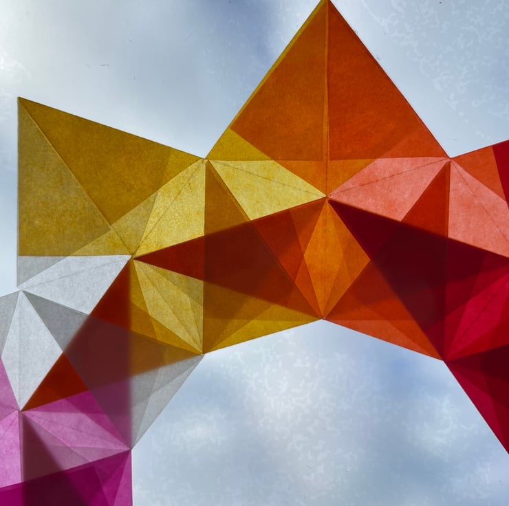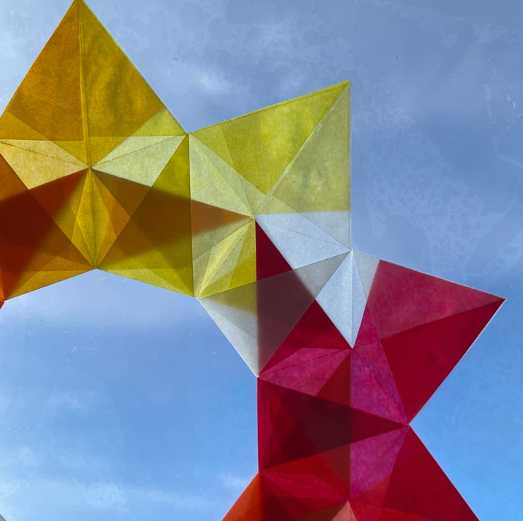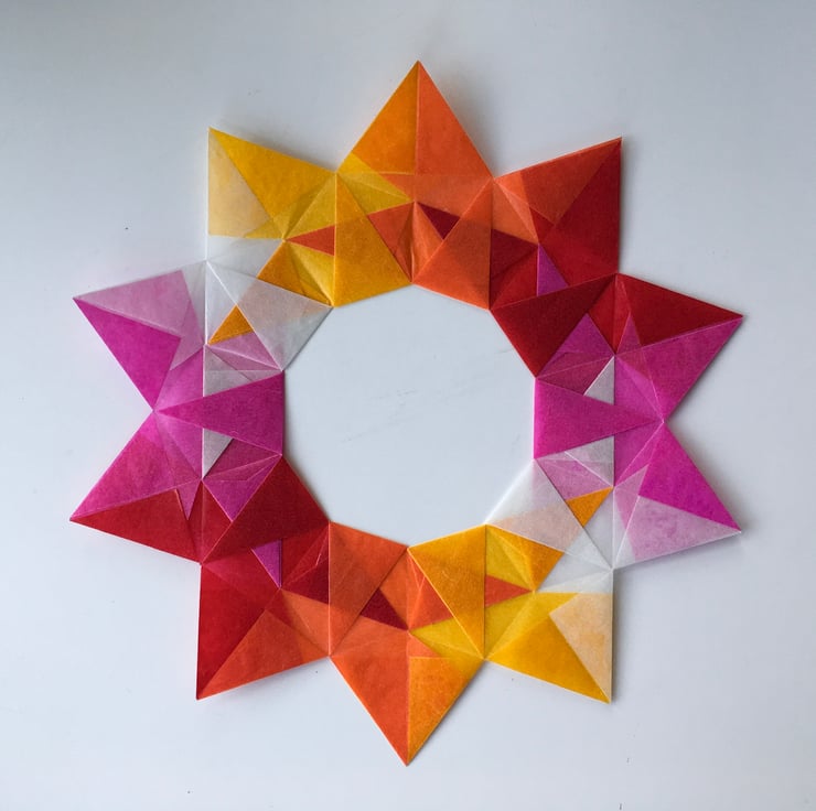 Beautiful and delicate folded paper Star Wreath Window decoration. Made from waxed kite paper this makes a lovely gift for the festive season but can also be displayed all year round. To appreciate the full detail and overlapping colours of this decoration attach the star wreath to a window and allow the sunlight to shine through, this way the patterns are revealed and the colours are seen at their best.